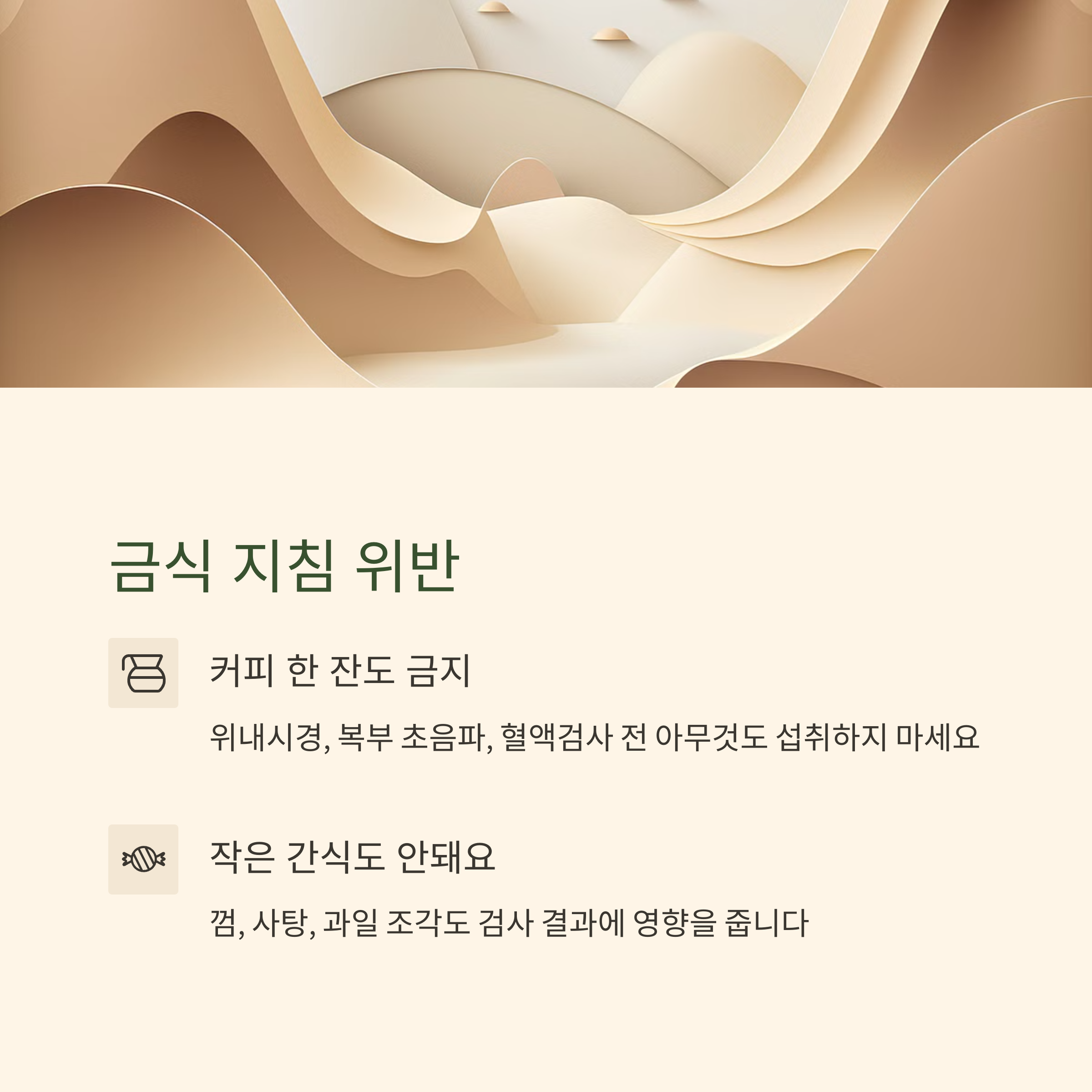 검진 당일, 가장 흔하면서도 치명적인 실수는 금식 지침 위반입니다.