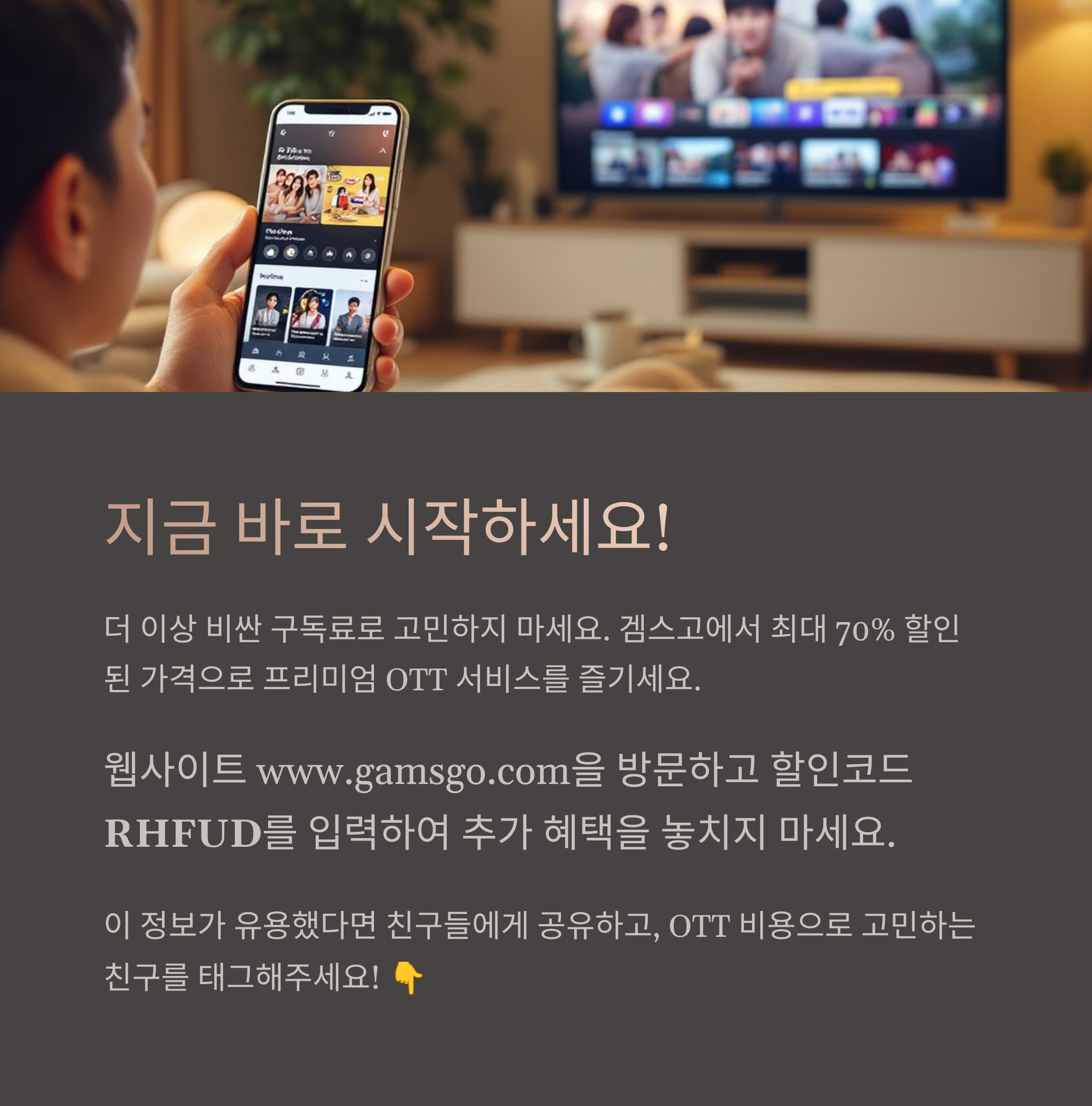 매달 쌓이는 OTT 구독료 부담, 유튜브 프리미엄 광고도 싫으시죠? 지금 소개해드릴 겜스고(GamsGo)는 넷플릭스, 디즈니플러스, 왓챠, 웨이브, 유튜브 프리미엄 등 다양한 플랫폼을 최대 70% 저렴하게 이용할 수 있는 합법 구독 공유 플랫폼입니다. 특히 할인코드 RHFUD를 사용하면 첫 결제 시 추가 할인을 받을 수 있어 기존보다 더 저렴하게 구독을 시작할 수 있습니다. 본문에서는 겜스고가 어떤 서비스인지, 할인코드 적용 방법은 어떻게 되는지, 실제 가격은 얼마인지, 이용 시 주의사항까지 꼼꼼히 총정리해드립니다. 매달 아끼고 싶다면 지금 바로 확인해 보세요.