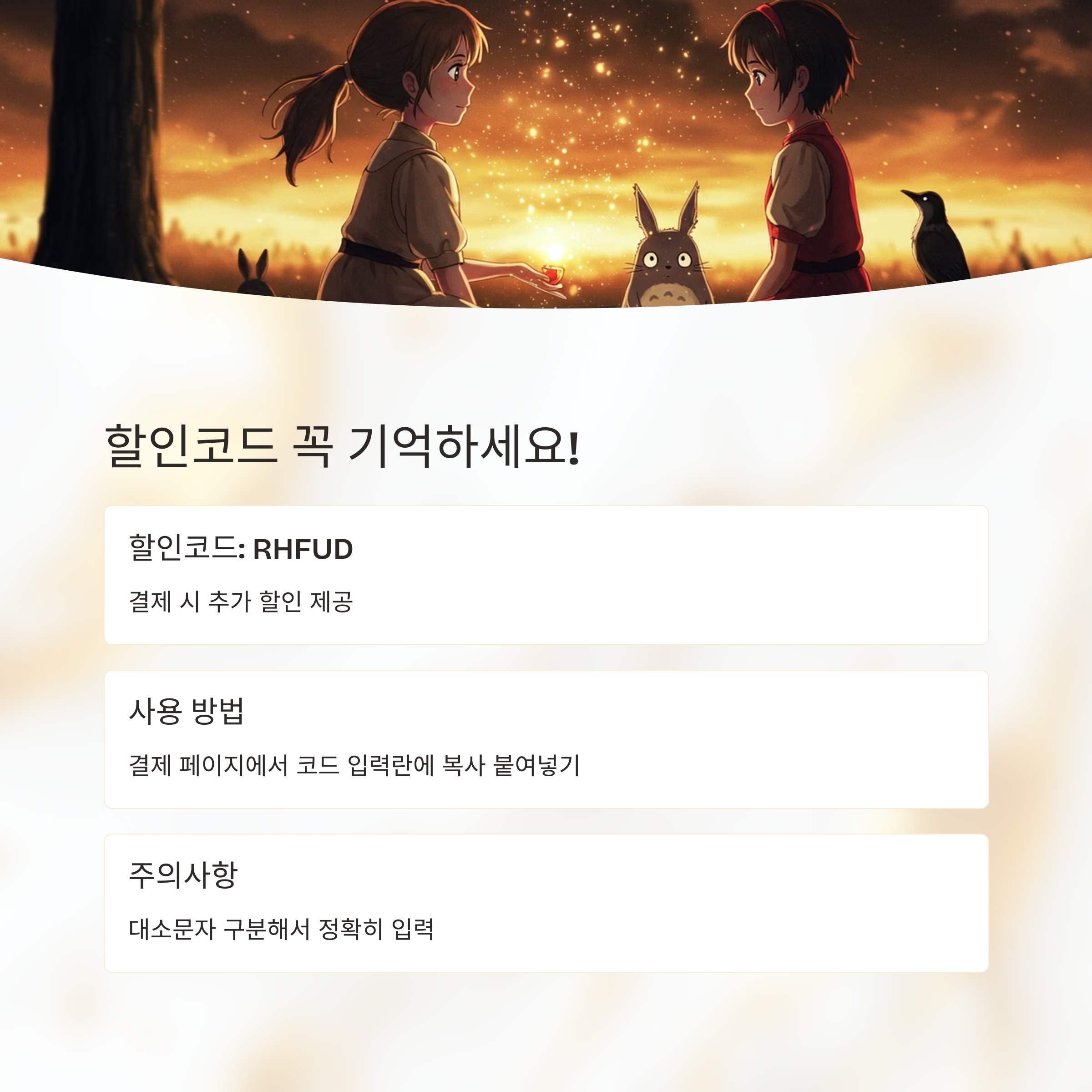 | 할인코드 입력 위치 | 결제 단계 쿠폰/코드 입력란에 RHFUD 입력 |