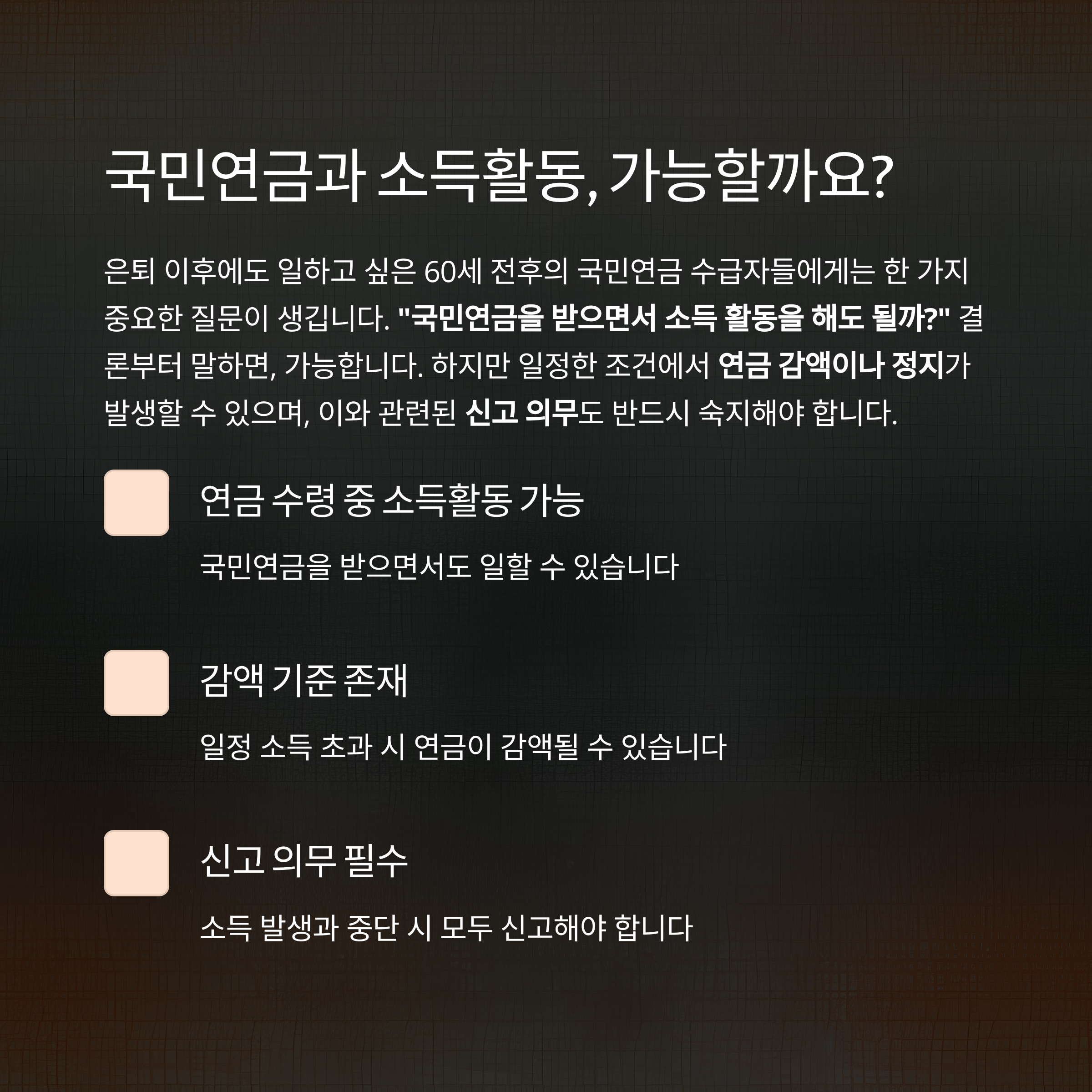 은퇴 이후에도 일하고 싶은 60세 전후의 국민연금 수급자들에게는 한 가지 중요한 질문이 생깁니다.