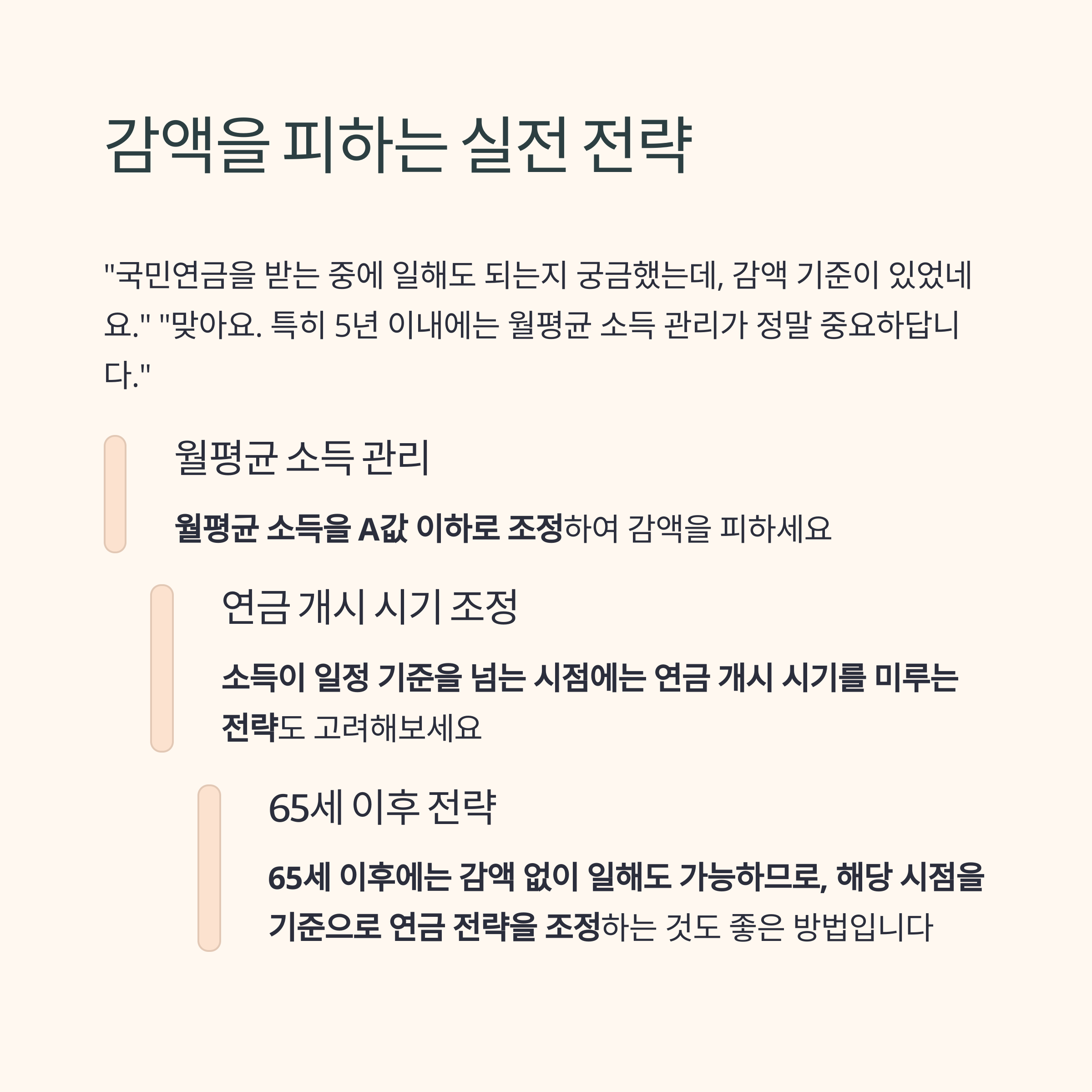 - 소득이 일정 기준을 넘는 시점에는 연금 개시 시기를 미루는 전략도 고려해 볼 수 있습니다.