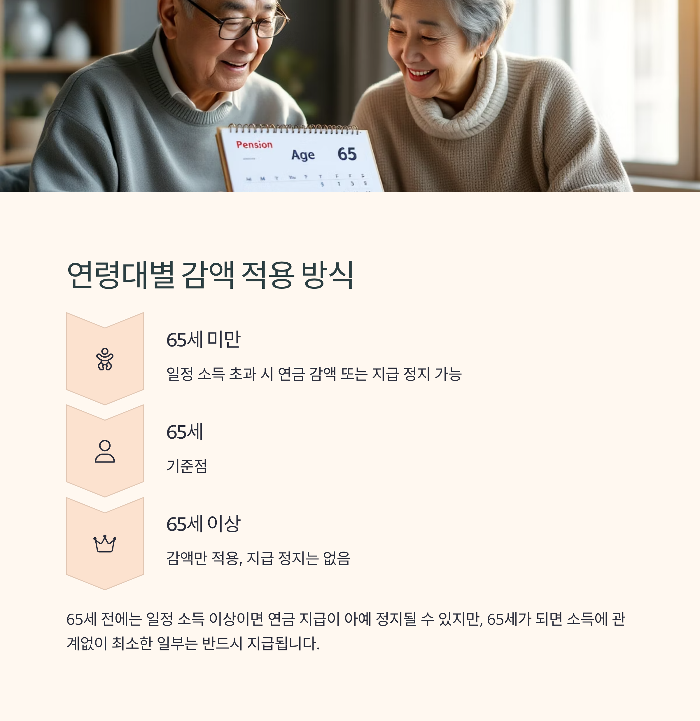 | 65세 미만 | 일정 소득 초과 시 연금 감액 또는 지급 정지 가능 |