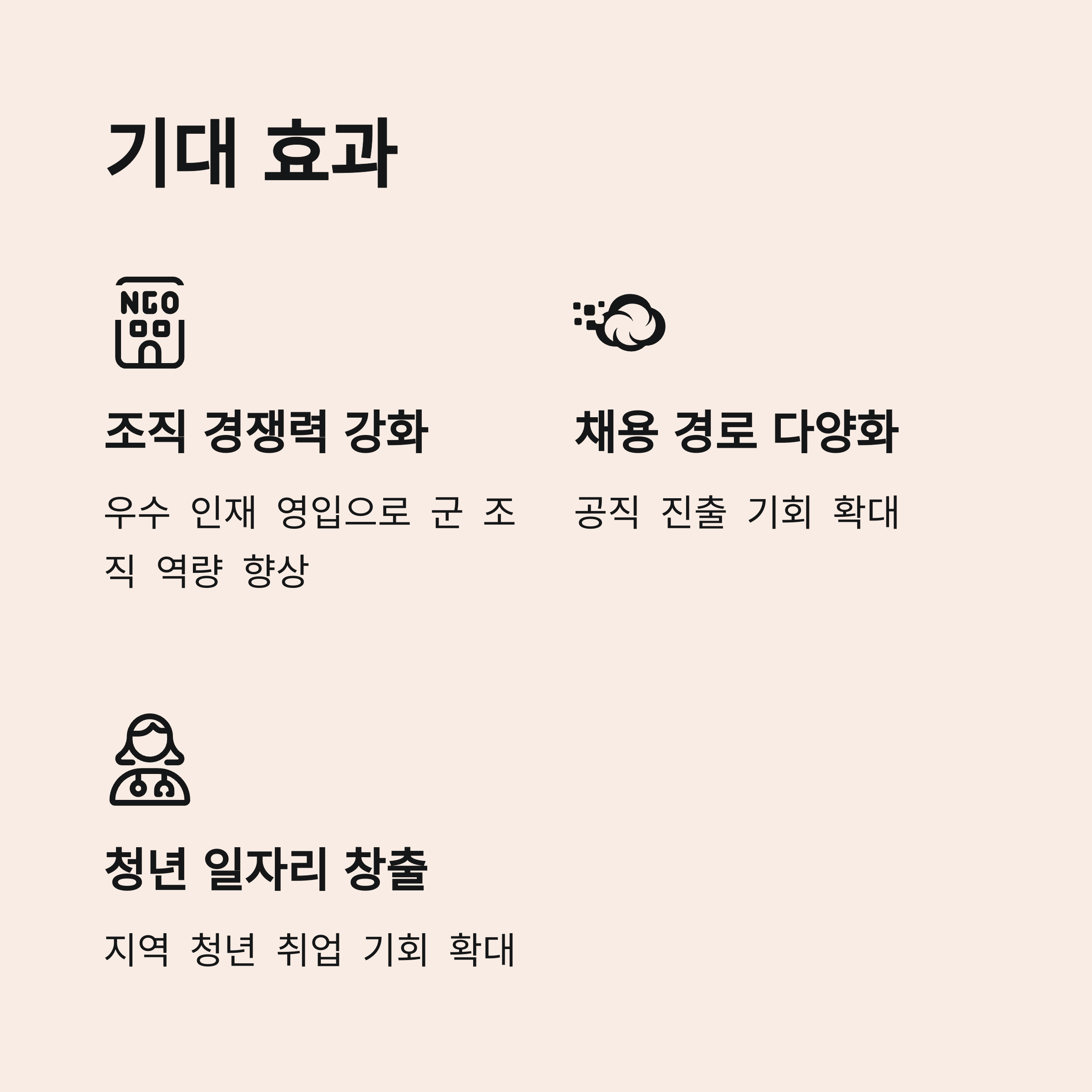 특히, 지역 근무 5년 조건이 포함되어 있으므로 자신의 지역에서 안정적으로 커리어를 시작할 수 있습니다. 공무원에 준하는 급여와 복지혜택, 승진 기회, 교육 프로그램도 함께 제공되어 군무원 경력은 매우 매력적인 선택이 될 수 있습니다. 지금부터 이 채용 제도의 상세 내용을 함께 살펴보겠습니다.