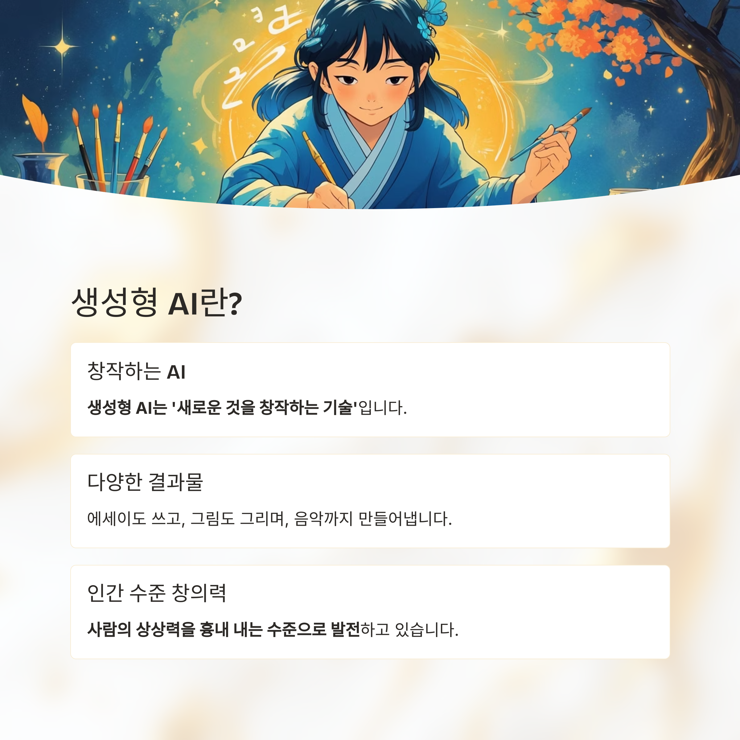 이제 AI는 에세이도 쓰고, 그림도 그리며, 음악까지 만들어냅니다.