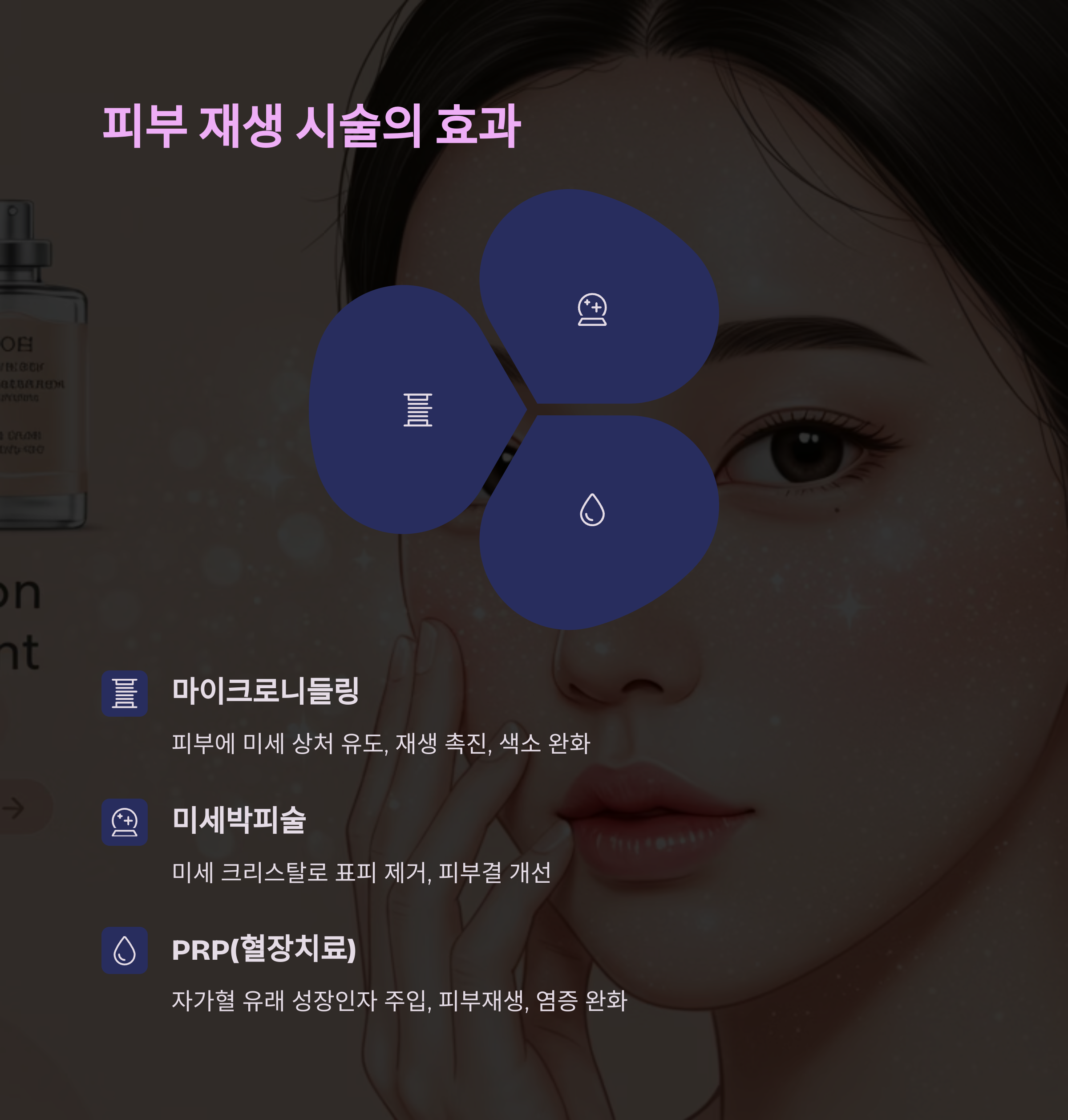 | PRP(혈장치료) | 자가혈 유래 성장인자 주입 | 피부재생, 염증 완화 |