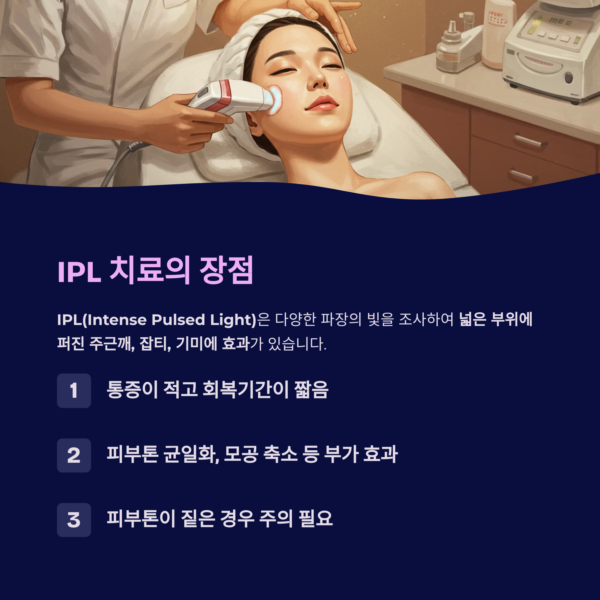 | IPL | 넓은 부위, 다양한 색소 치료 가능 | 피부톤에 따라 부작용 발생 가능 |