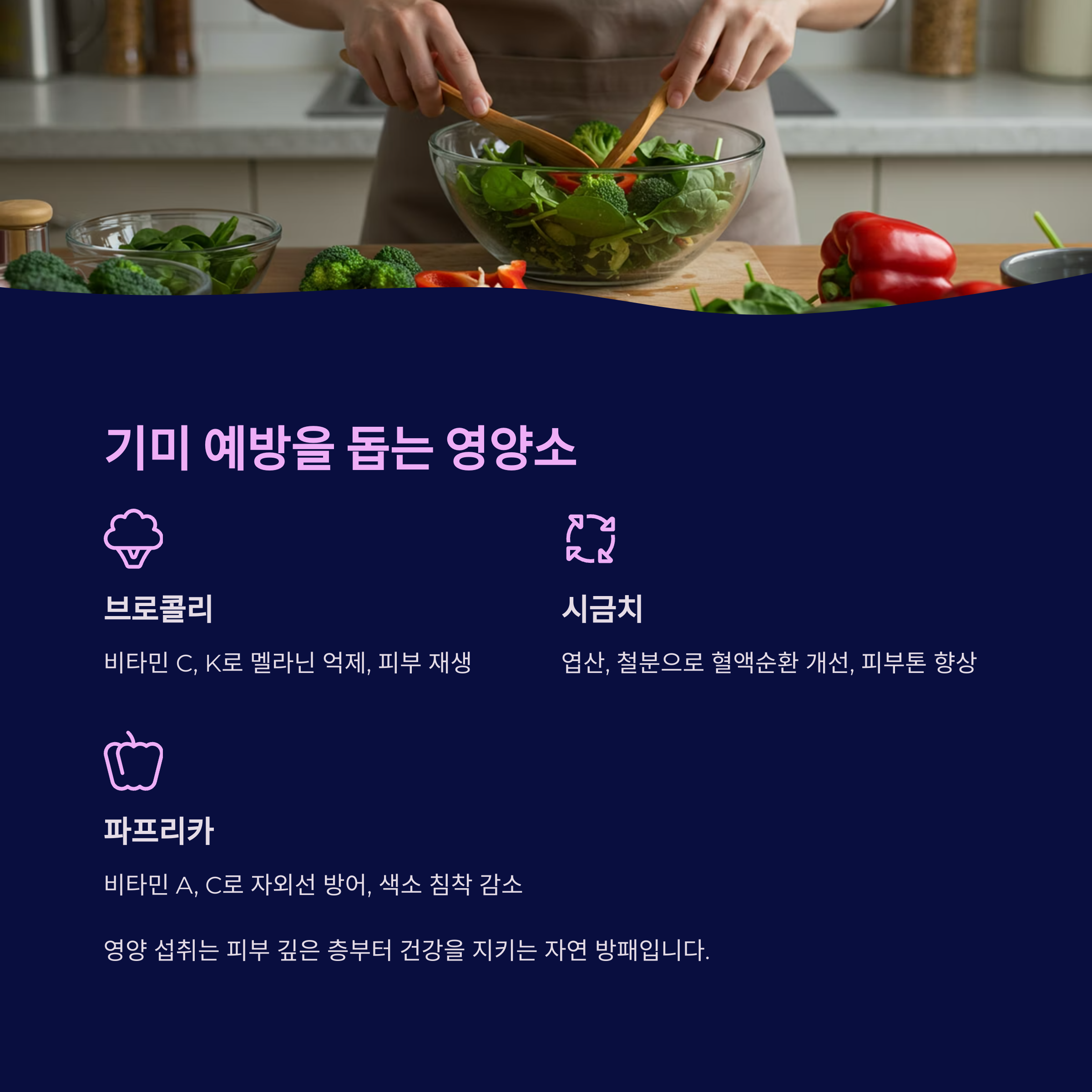 | 브로콜리 | 비타민 C, K | 멜라닌 억제, 피부 재생 |