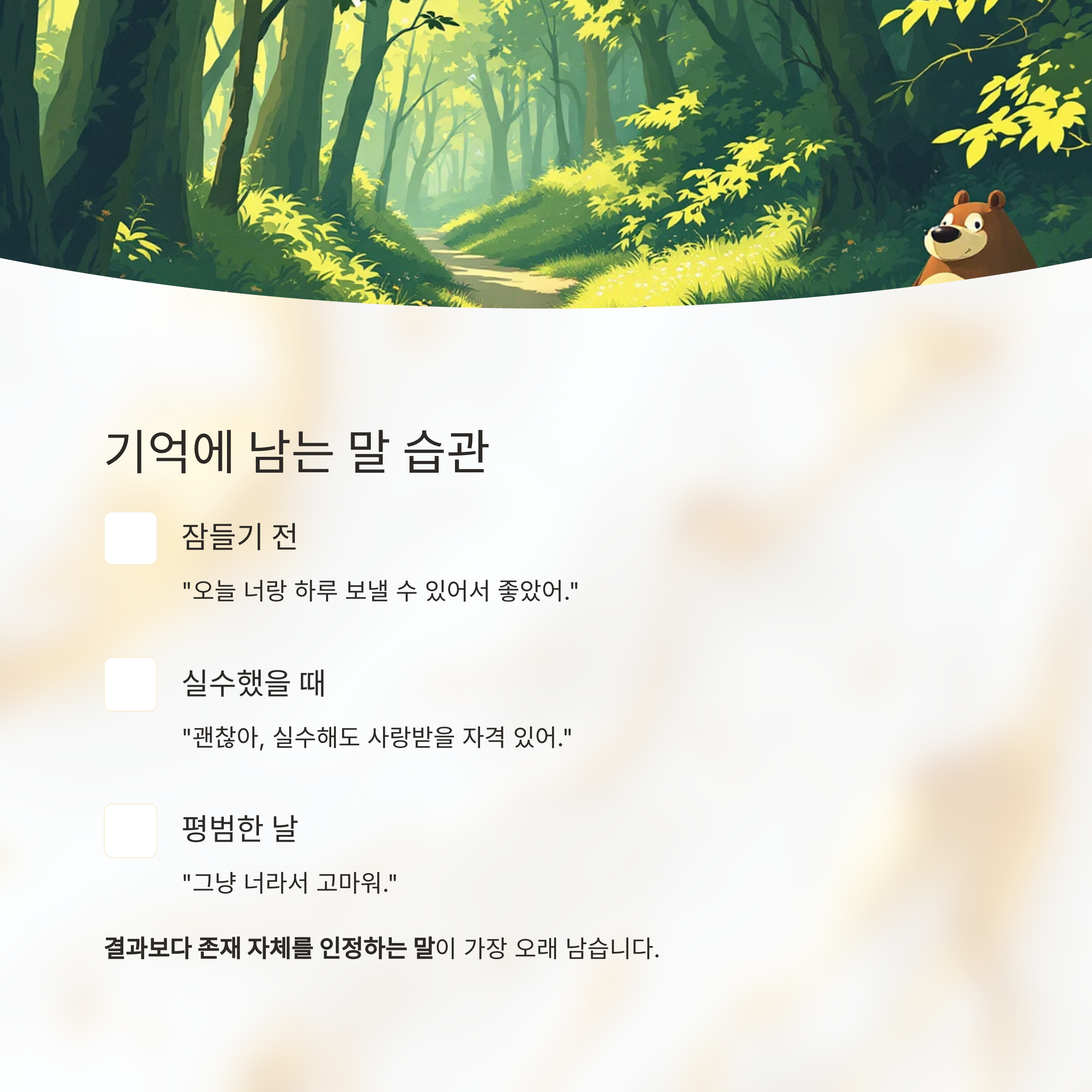 | 실수했을 때 | “괜찮아, 실수해도 사랑받을 자격 있어.” | 자기수용력 향상 |