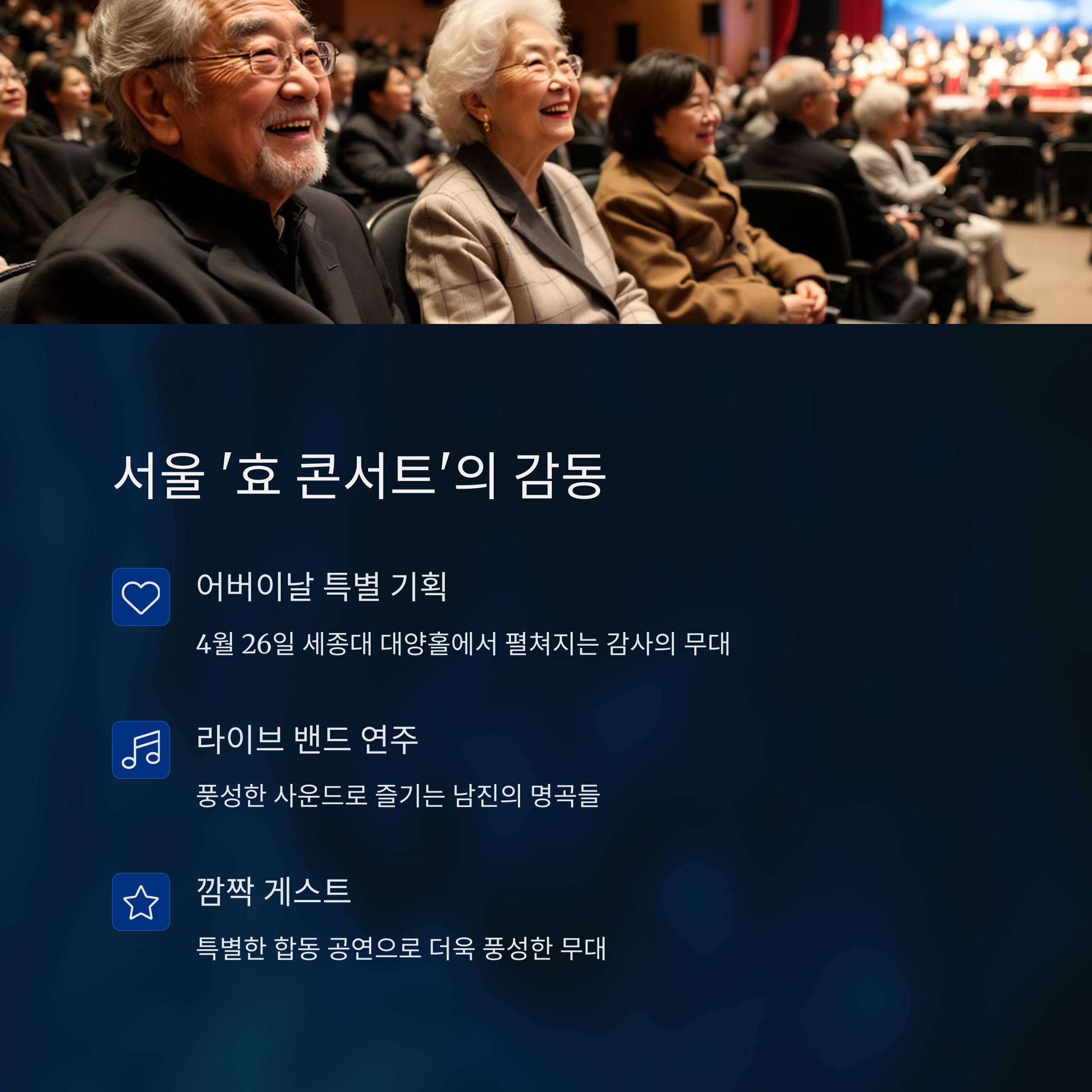 4월 26일, 세종대학교 대양홀에서 열리는 '효 콘서트'는 단순한 공연을 넘어 감사와 사랑을 전하는 무대입니다. 남진이 직접 기획에 참여해 어버이날을 앞두고 준비한 이 공연은 어르신 팬들에게 특별한 선물이 될 예정이에요.