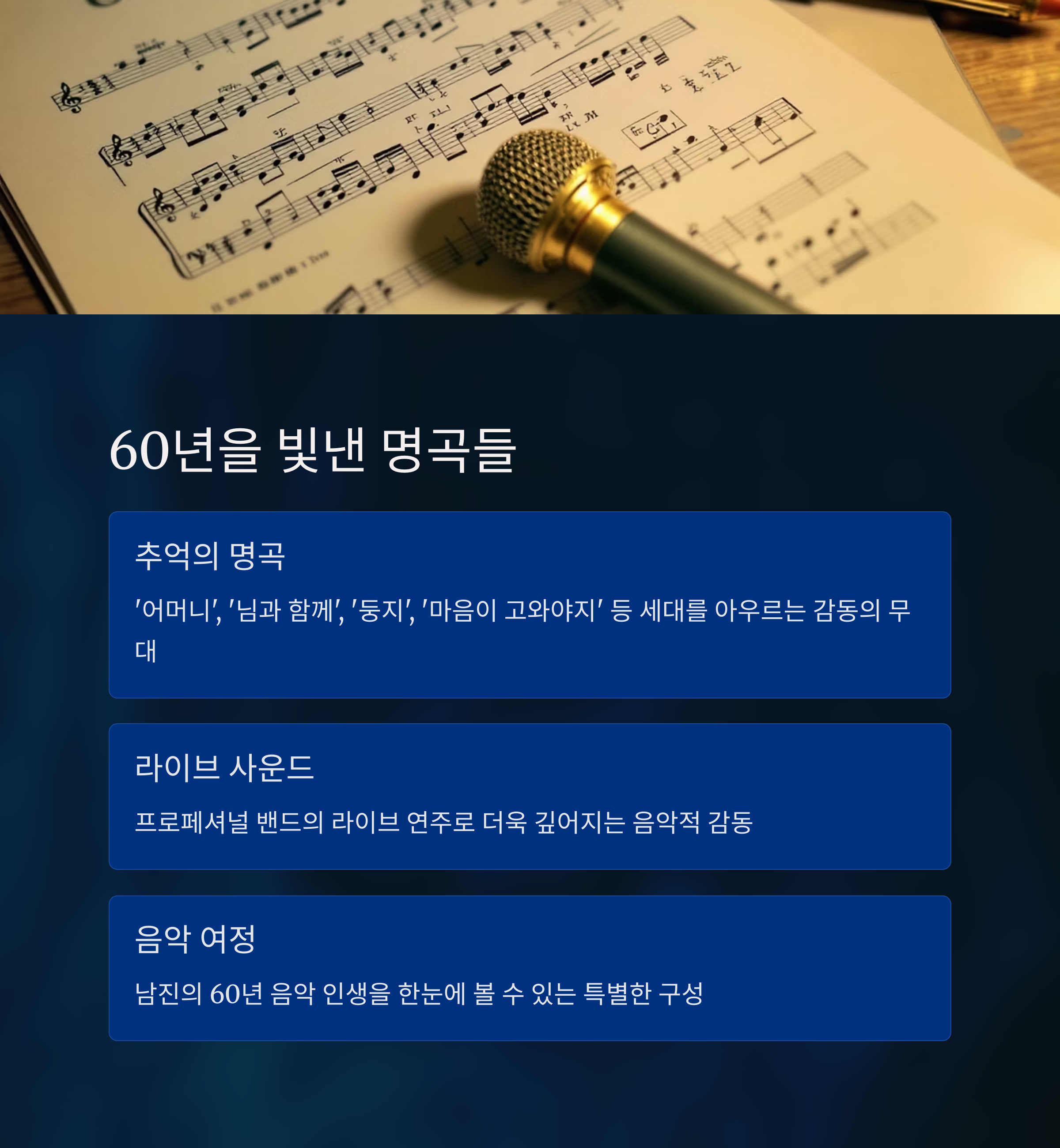 남진의 60주년 전국투어 콘서트는 단순한 음악 공연이 아닙니다. 우리 부모님 세대가 가슴속에 품고 살아온 추억, 그리고 세대를 뛰어넘는 감동이 살아 있는 무대예요. 이 글을 통해 여러분도 남진의 음악과 함께하는 따뜻한 시간을 상상하셨기를 바라요.