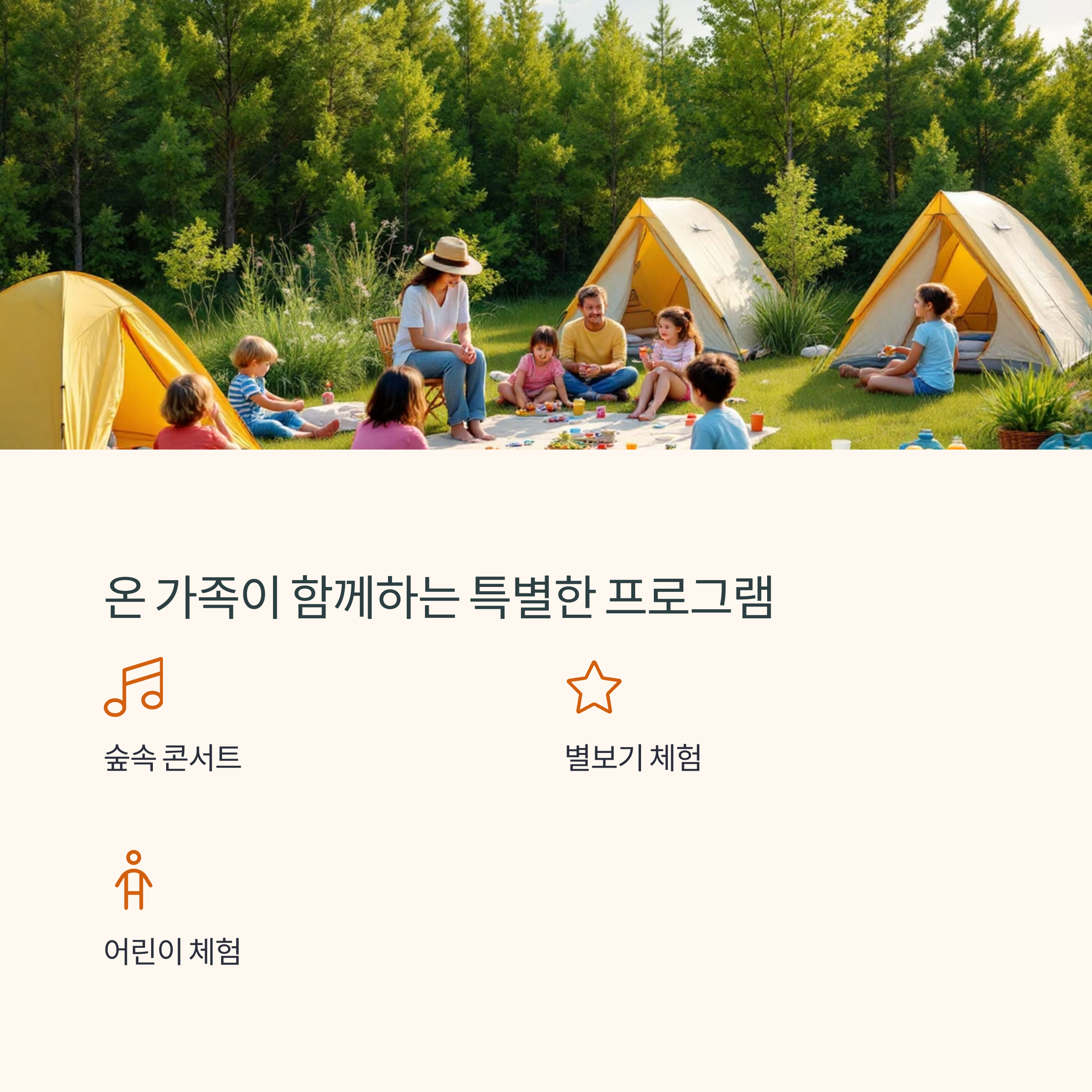 메인 프로그램은 캠핑요리대회입니다. ‘나만의 캠핑요리’를 주제로 직접 개발한 레시피를 제출하면 1차 온라인 심사를 거쳐 본선 진출 여부가 결정됩니다. 본선 당일엔 현장에서 직접 요리를 만들고 심사를 받게 되며, 최종 수상자는 최대 1,000만 원 상당 상금과 부상을 받습니다. 그 외에도 ‘숲 속 콘서트’, ‘별 보기 체험’, ‘어린이 요리교실’, ‘전통놀이’, ‘달고나 뽑기’, ‘전기자전거 체험’ 등 남녀노소 누구나 즐길 수 있는 부대 프로그램이 알차게 구성되어 있습니다.
