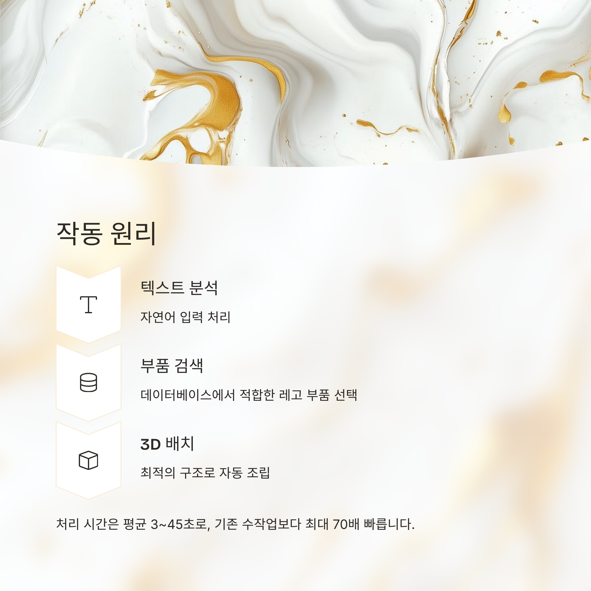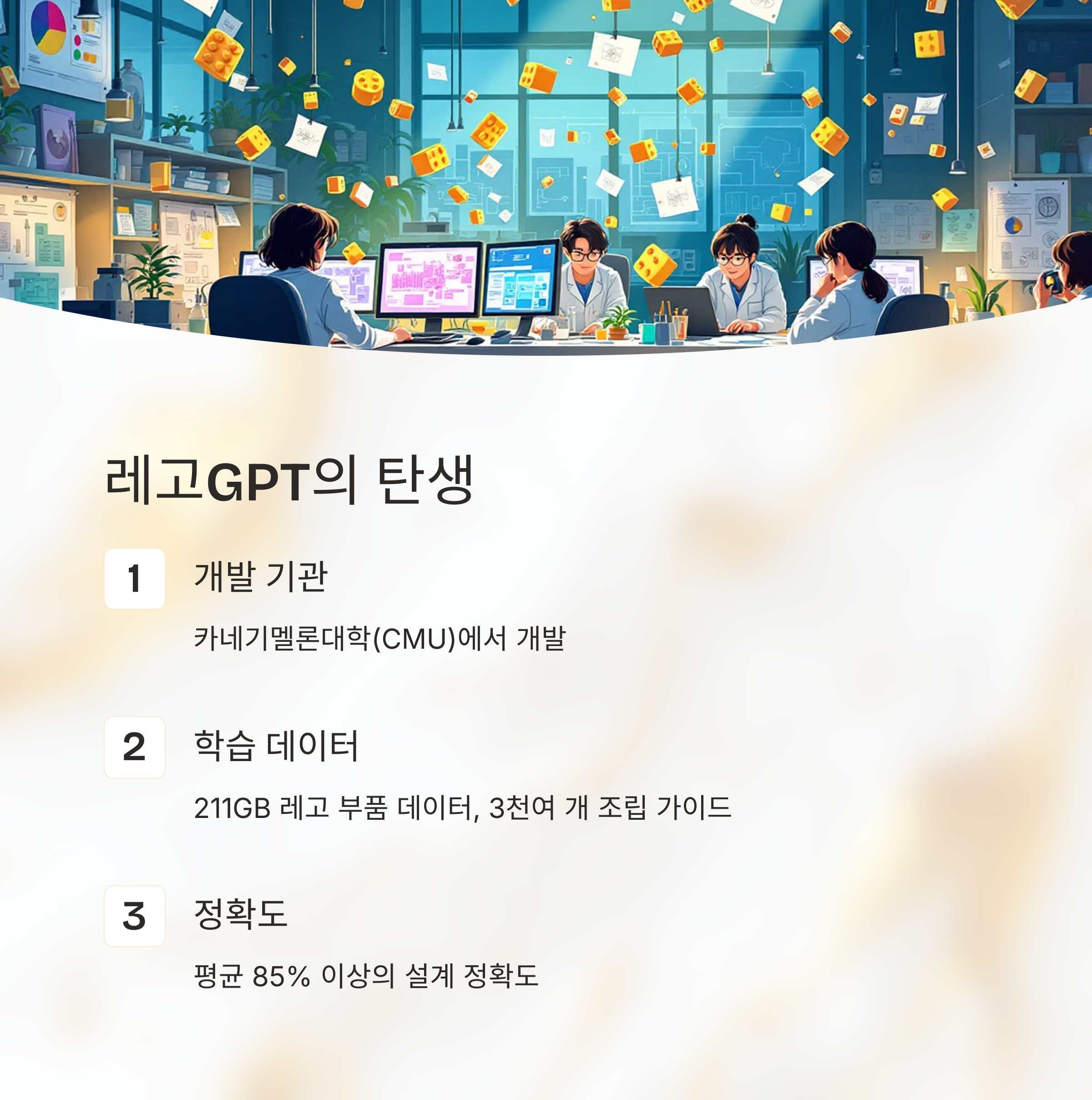 총 211GB에 달하는 방대한 레고 부품 데이터와 3천여 개의 공식 조립 가이드를 학습하며 훈련되었고, 평균 85% 이상의 설계 정확도를 보여줍니다.