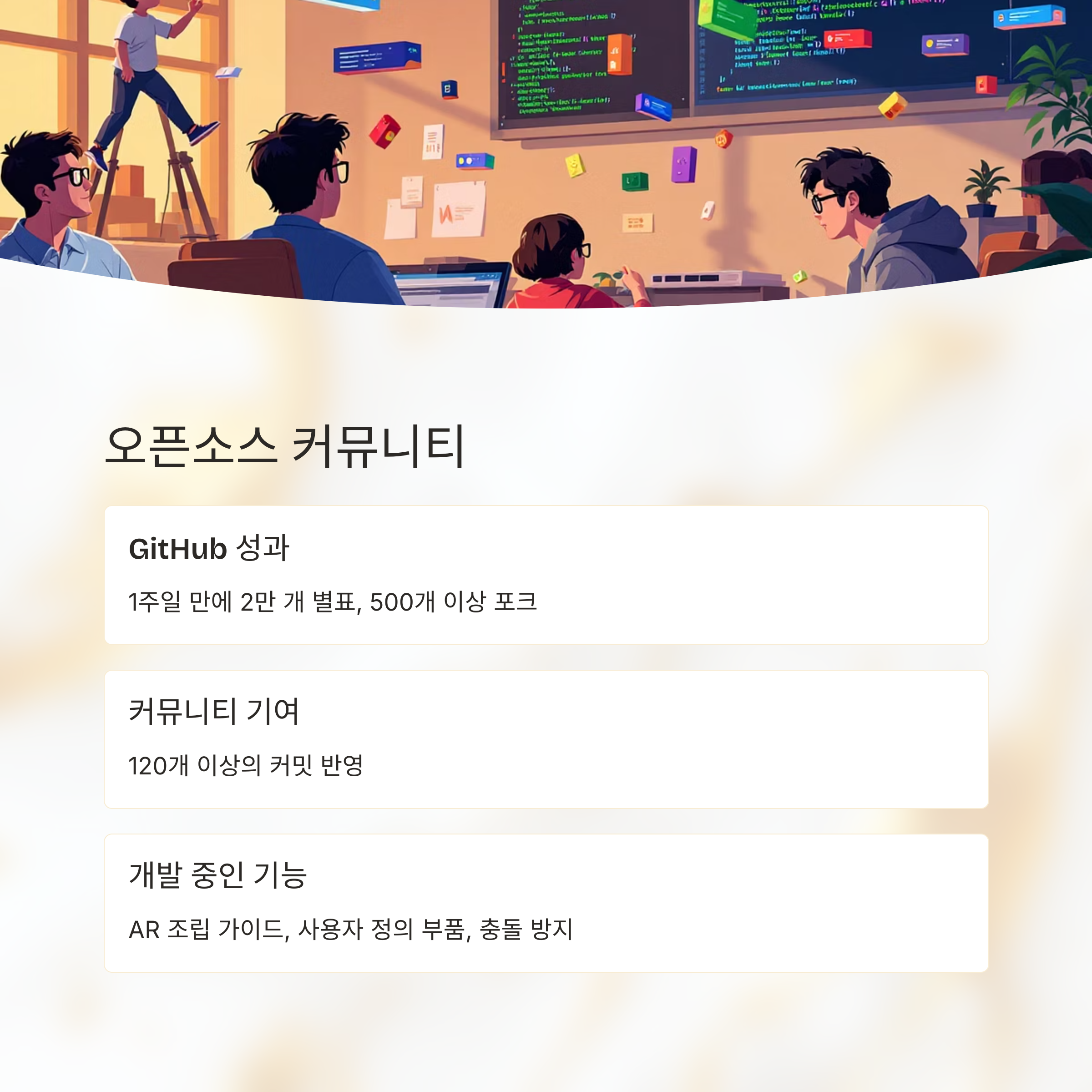 이미 120개 이상의 커밋이 반영되었고, 커뮤니티를 통해 AR 조립 가이드, 사용자 정의 부품 추가, 충돌 방지 기능 등 다양한 기능이 개발 중입니다.