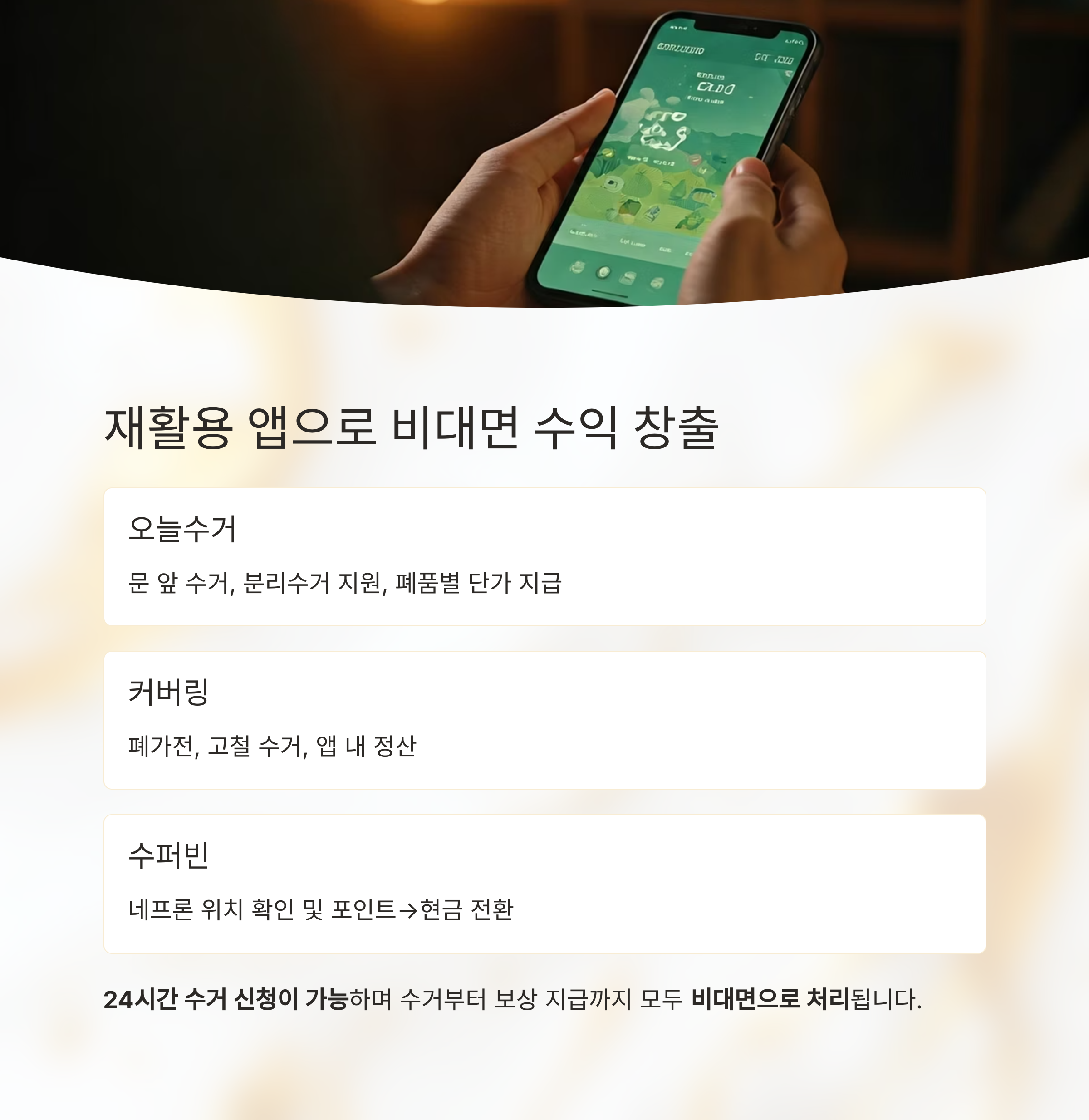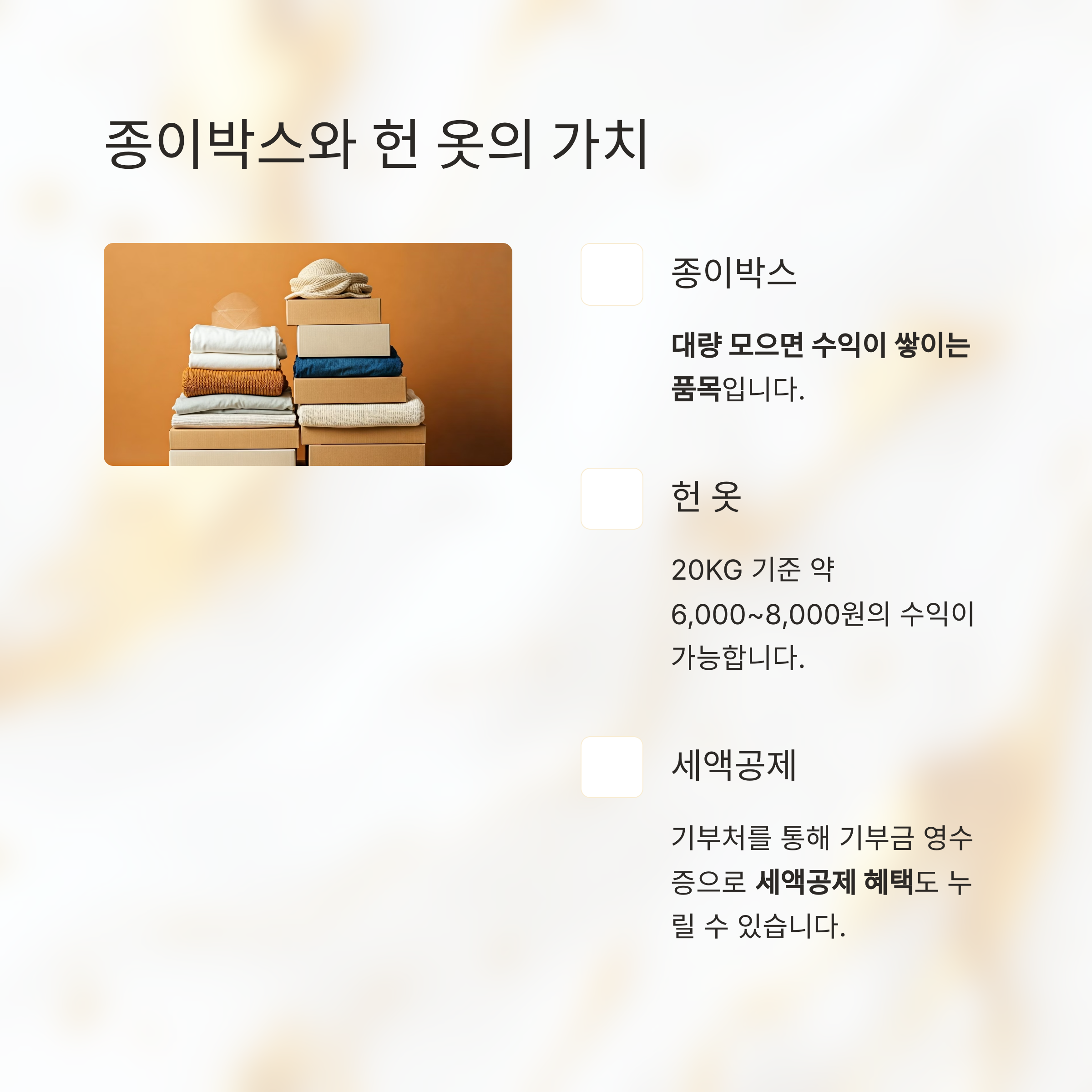 핵심: "비좁은 베란다 차지하던 박스와 헌 옷이 작지만 알찬 수익원이 됩니다"