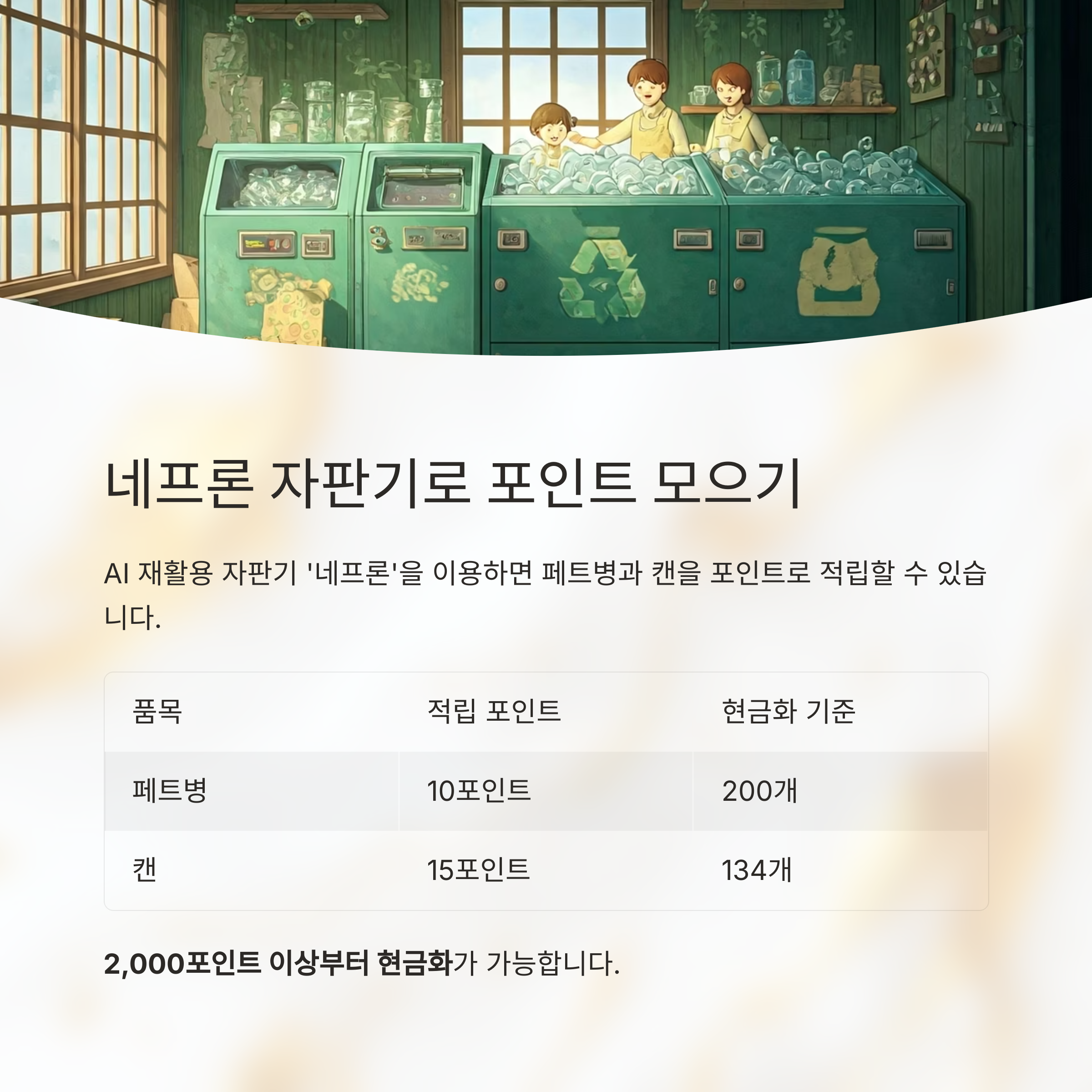 AI 재활용 자판기 '네프론'을 이용하면 페트병과 캔을 포인트로 적립할 수 있으며