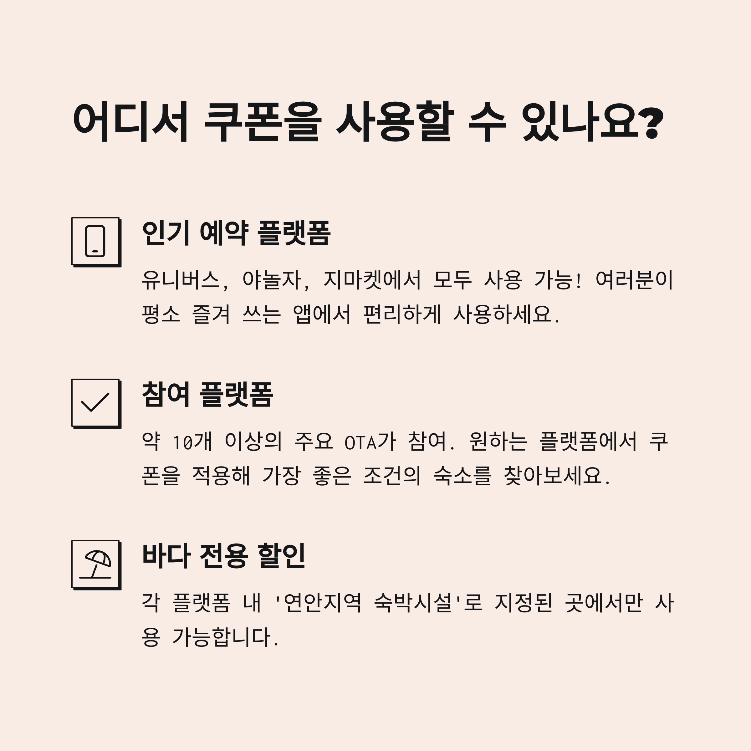 해당 쿠폰은 유니버스, 야놀자, 지마켓 등 주요 온라인 예약 플랫폼에서 발급 및 사용이 가능합니다.