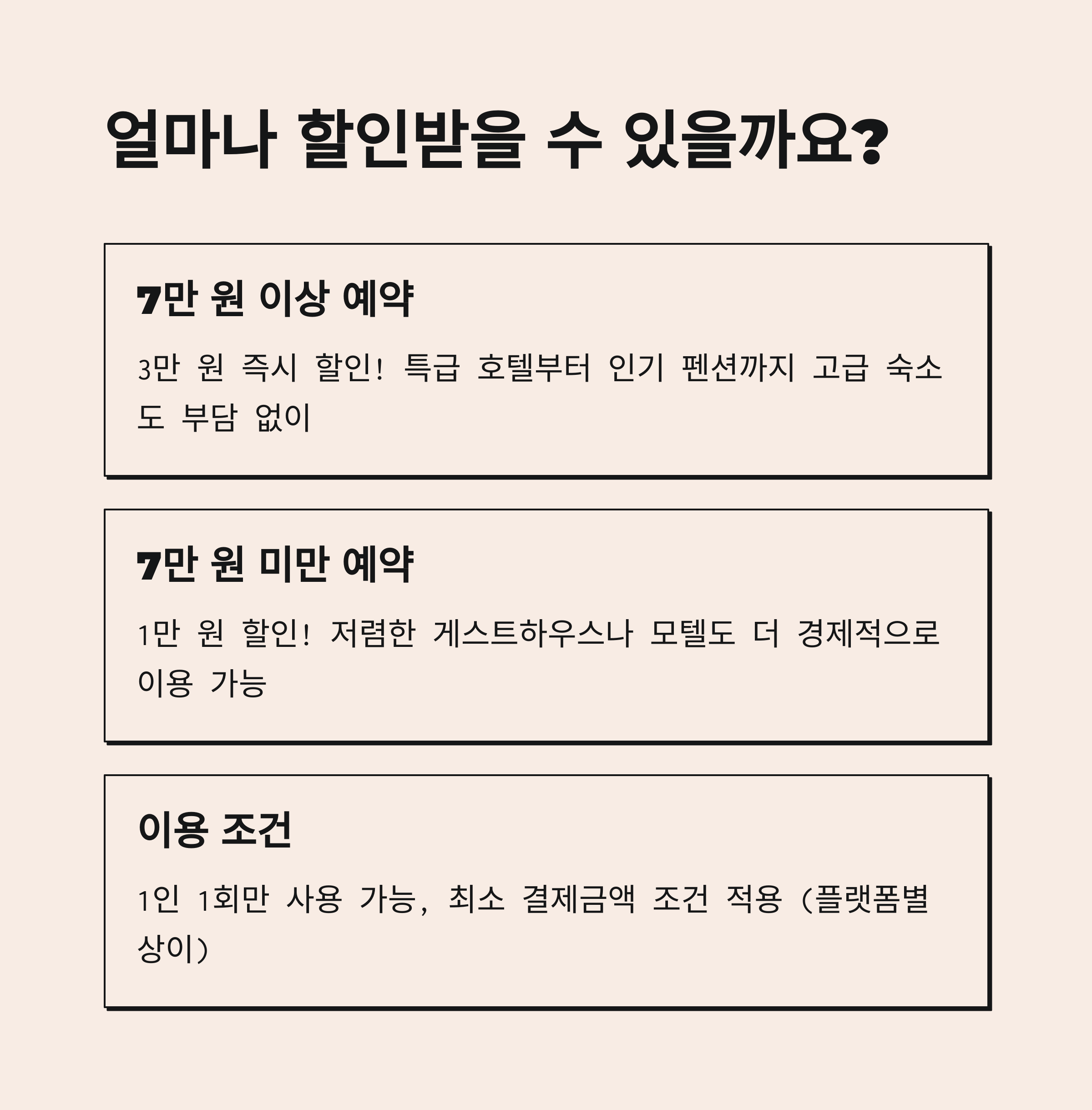 - 7만 원 이상 숙소 예약 시: 3만 원 할인