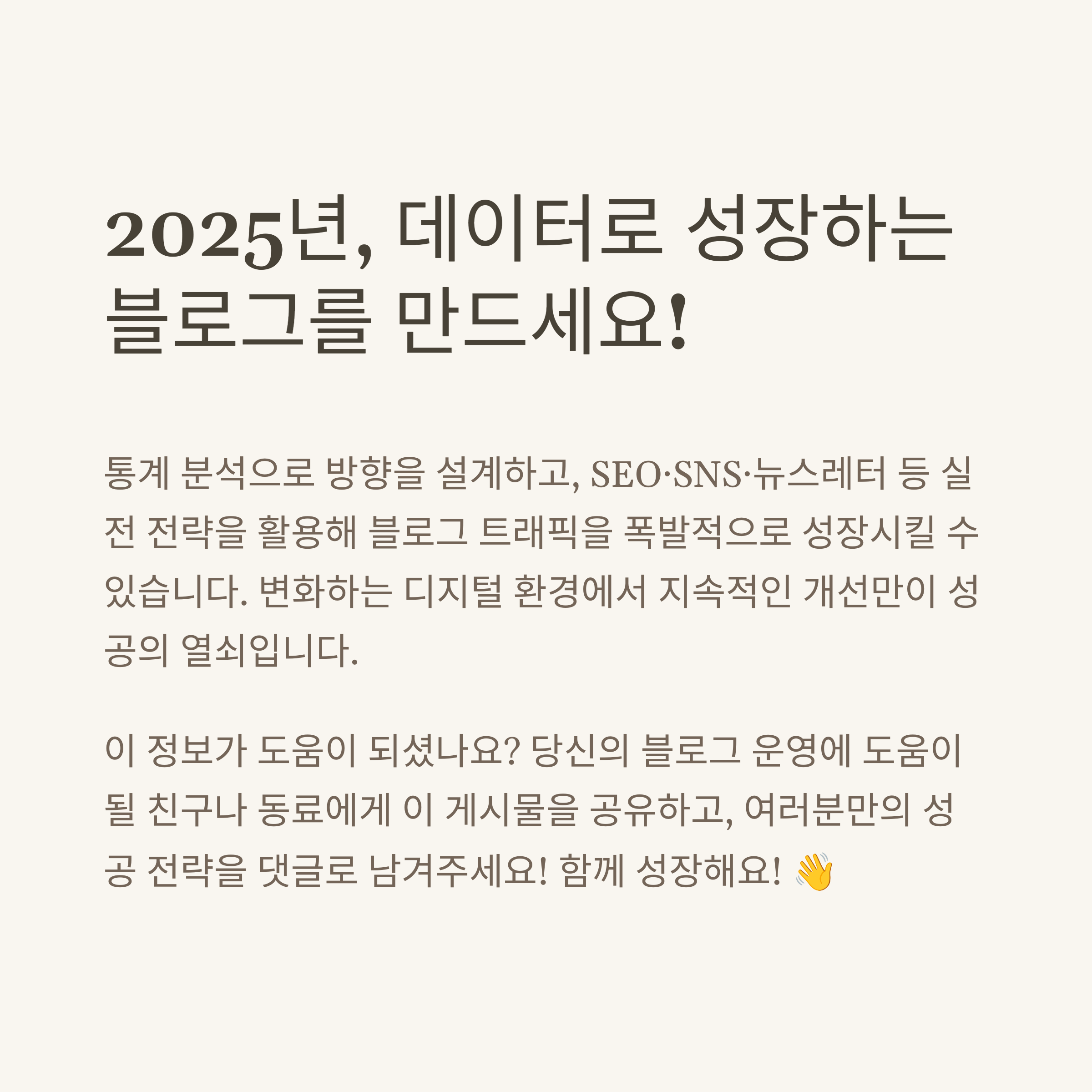 블로그 성공의 핵심은 정확한 통계 분석과 전략적 실행입니다. 데이터를 통해 방문자의 흐름을 파악하고, 그에 맞는 콘텐츠와 마케팅 전략을 수립한다면 지속적인 성장이 가능합니다. 2025년에도 SEO 최적화, SNS 연계, 이메일 구독 시스템, 페이지 최적화 등 다양한 방법들이 효과적으로 작용합니다. 트렌드에 민감하게 반응하며 독자 중심의 운영을 지속한다면, 블로그는 강력한 플랫폼으로 성장할 수 있습니다. 지금 바로 통계부터 확인해 보세요.