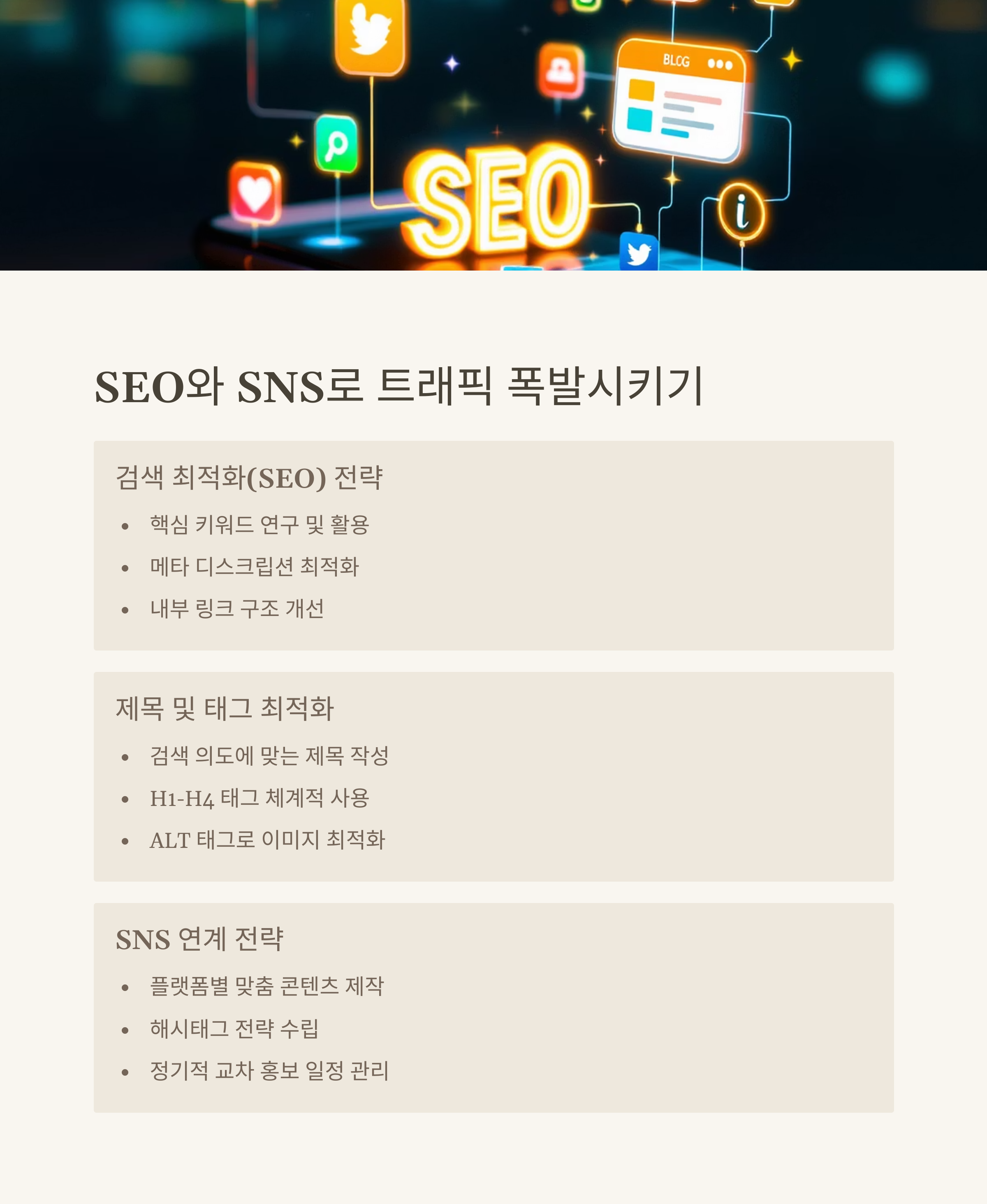 | 방문자 늘리기 | SEO, SNS, 이메일, 콘텐츠 전략 실행 |