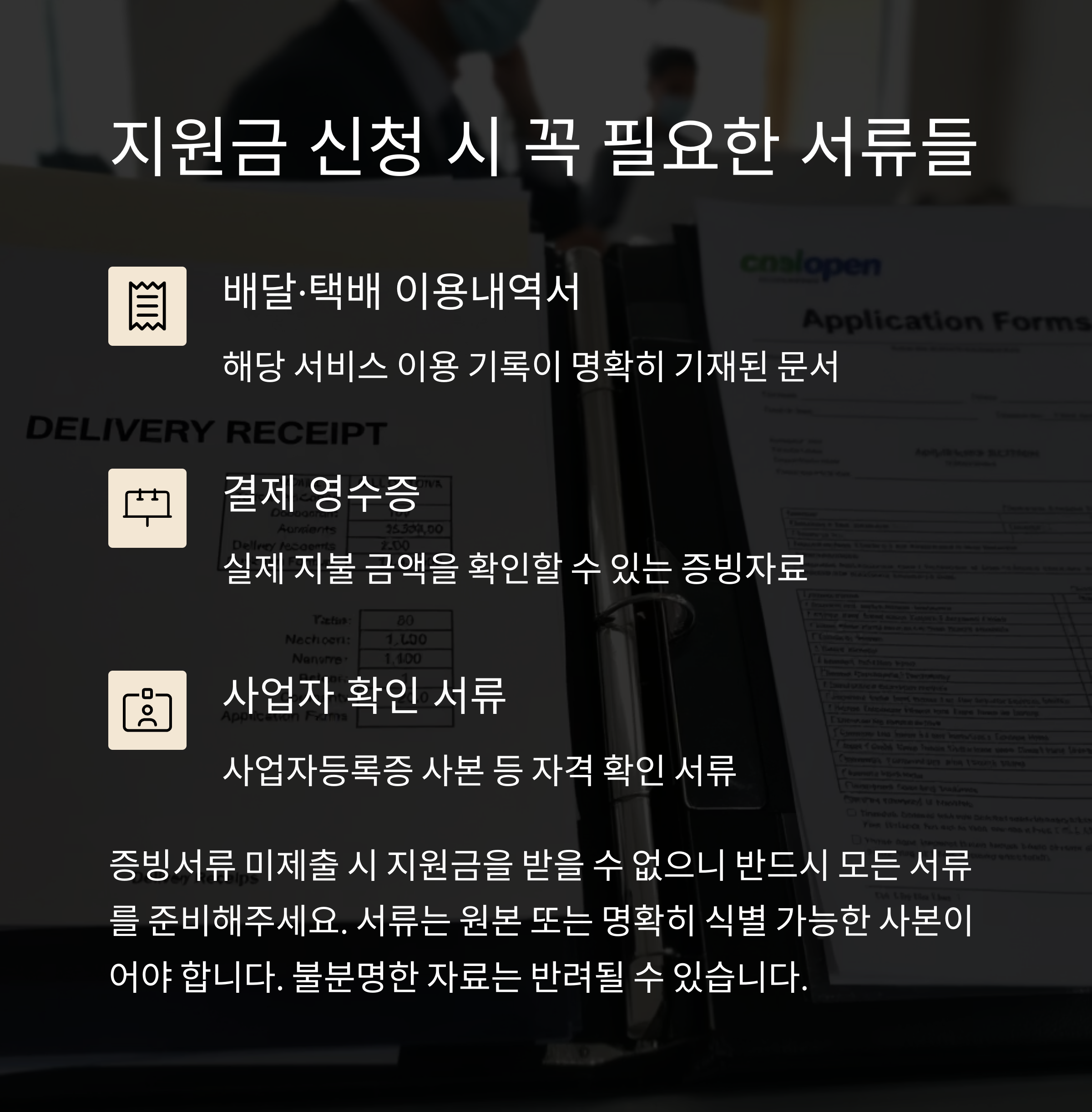 | 배달/택배 이용 | 전자(세금)계산서, 카드영수증, 운송장, 정산내역, 상인회 배달장부(직인필수) |