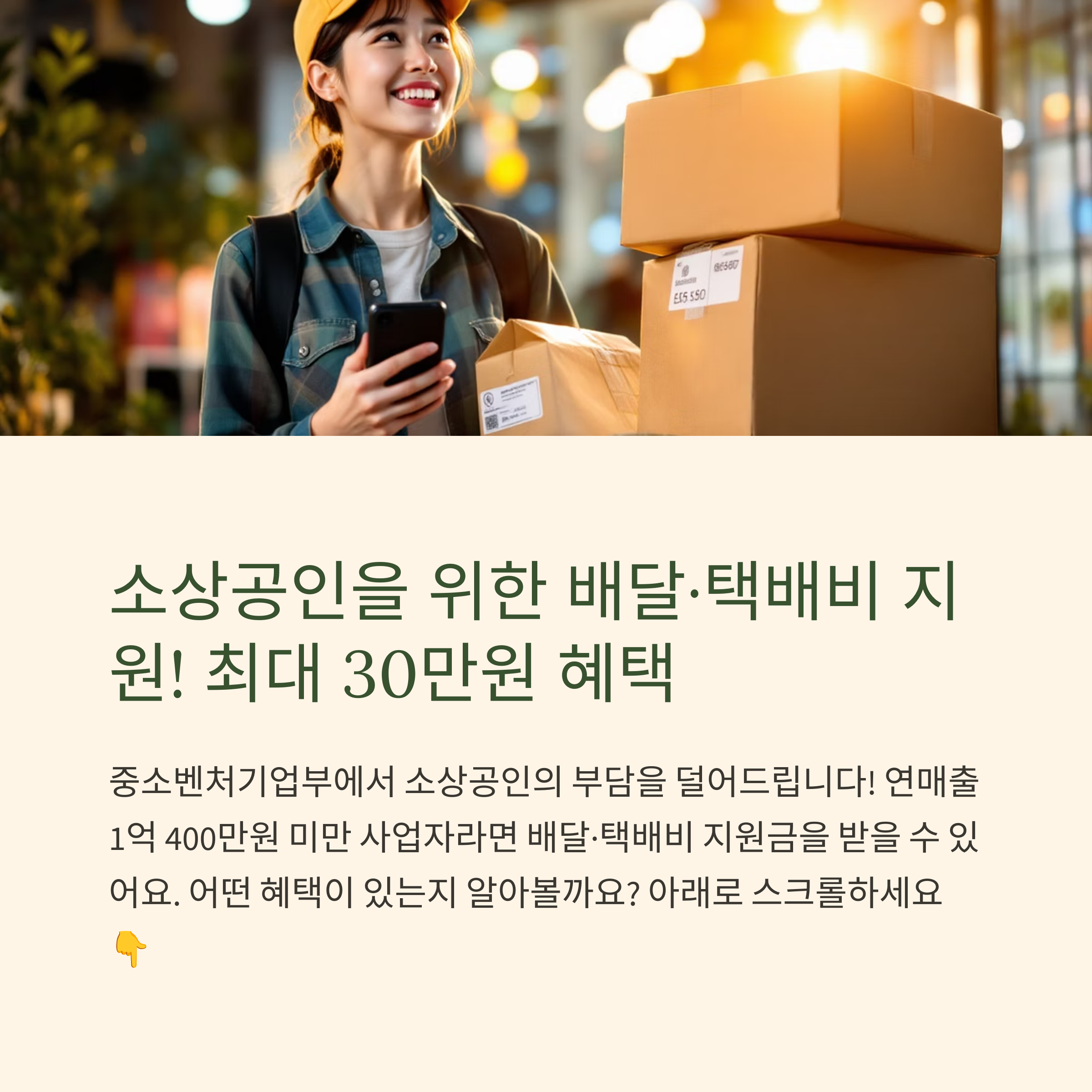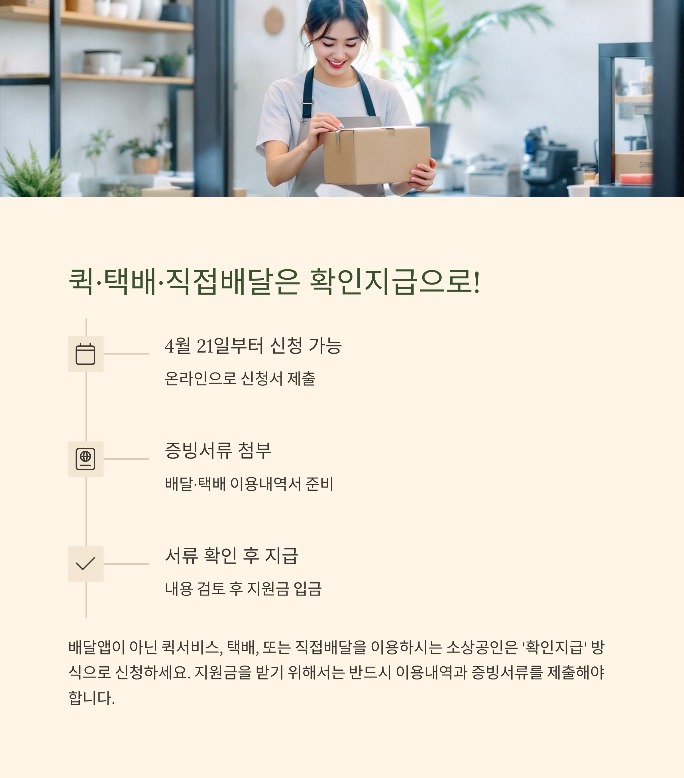 안녕하세요! 저도 자영업을 하는 입장에서 배달비나 택배비처럼 매달 고정으로 나가는 비용이 얼마나 부담되는지 너무 잘 압니다. 그런데 중소벤처기업부에서 이 부담을 조금이나마 덜어주기 위해 ‘소상공인 배달·택배비 지원사업’을 시행하고 있다는 사실, 알고 계셨나요? 4월 21일부터는 ‘확인지급’ 신청도 시작되었으니 자세히 알려드릴게요. 서류, 대상 조건, 신청방법까지 총정리했으니 끝까지 확인해 보세요!