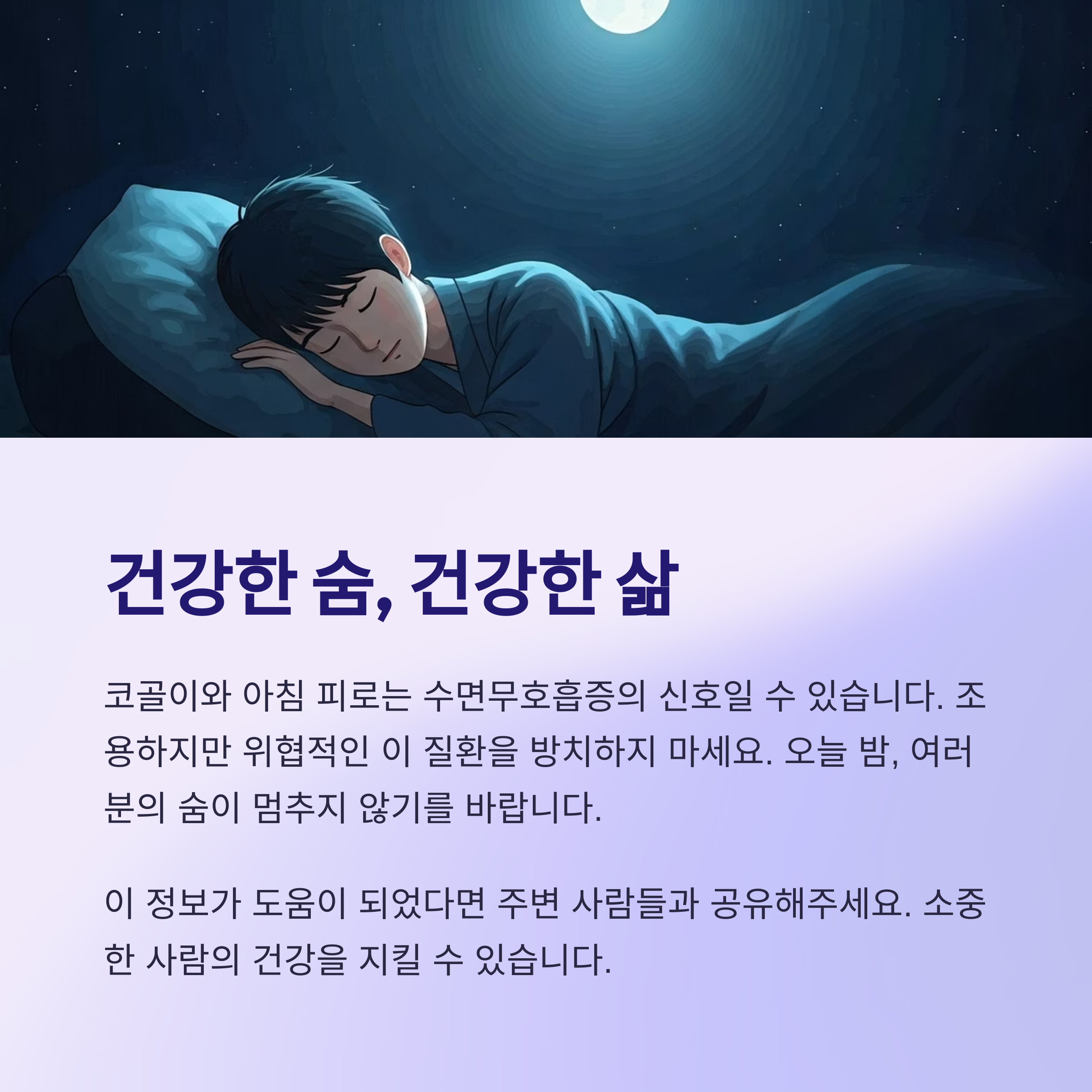 아무렇지 않게 여겨지던 코골이와 아침 피로, 사실은 수면무호흡증이라는 질환의 신호일 수 있습니다. 저는 뒤늦게 이를 인지하고 병원에 가서 진단을 받고 나서야 왜 그토록 피곤했는지를 알게 되었죠. 조용하지만 위협적인 이 질환을 방치하지 말고, 미리 체크하고 개선하는 것이 가장 현명한 선택입니다. 이 글을 통해 자신의 증상을 다시 한번 돌아보고, 필요하다면 꼭 전문가의 도움을 받아보시길 바랍니다. 오늘 밤, 여러분의 숨이 멈추지 않기를 바랍니다.