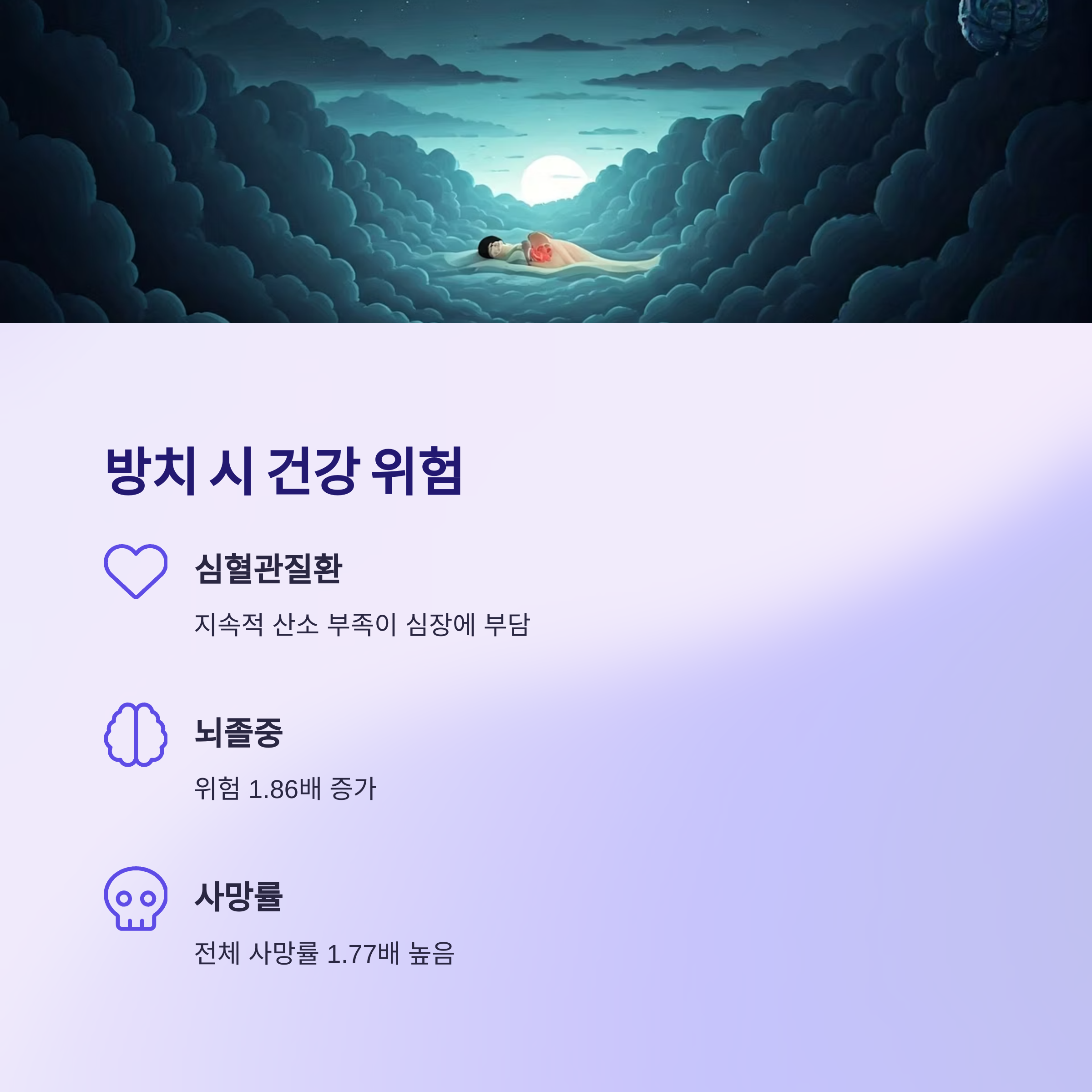 수면무호흡증은 단순한 수면 문제를 넘어, 온몸의 건강에 영향을 미치는 질환입니다. 계속되는 산소 부족은 심장, 뇌, 내분비계에 악영향을 주죠. 특히 심혈관질환, 뇌졸중, 당뇨, 고혈압 등 치명적인 합병증으로 이어질 수 있습니다.