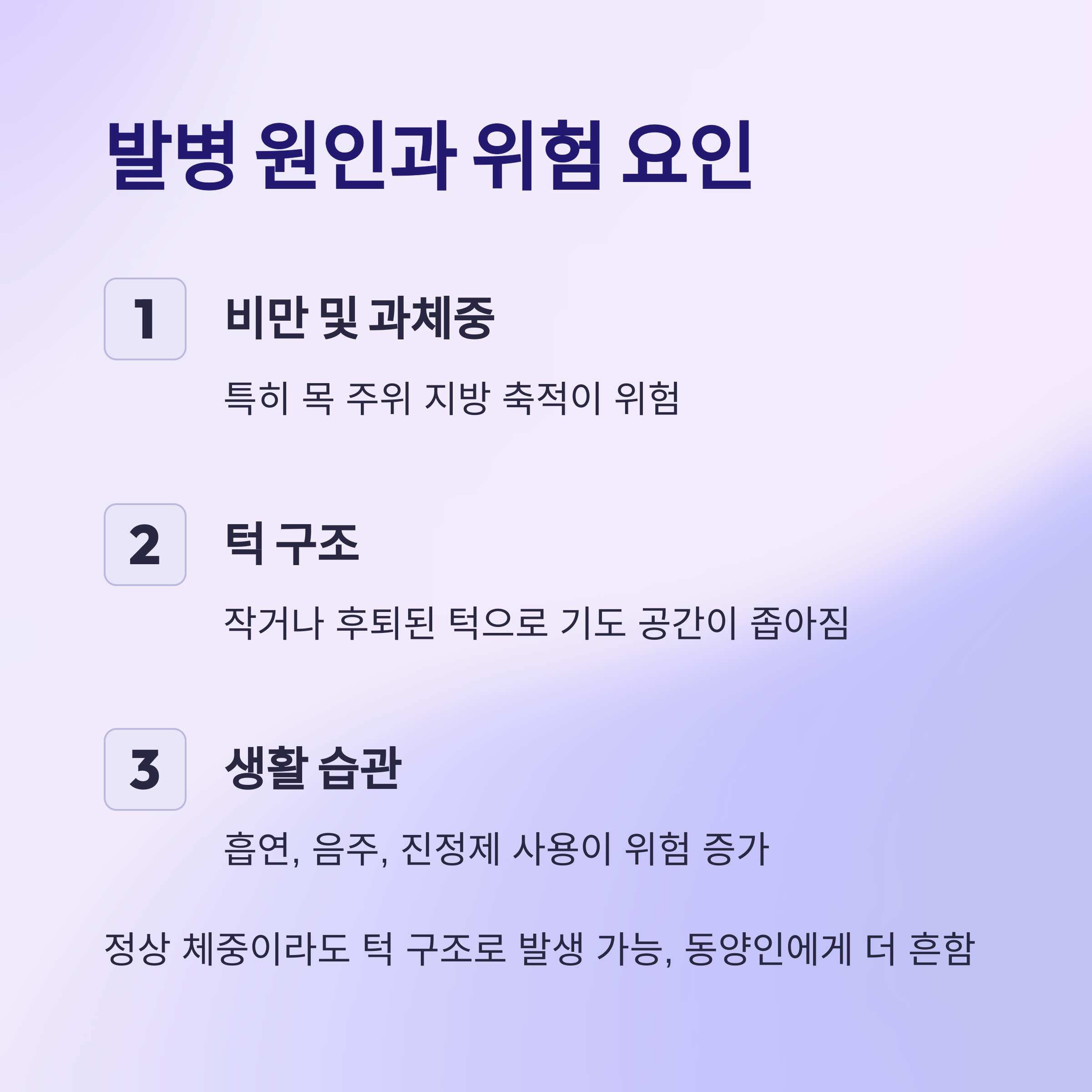 - 비만 및 과체중 (특히 목 주위 지방 축적)