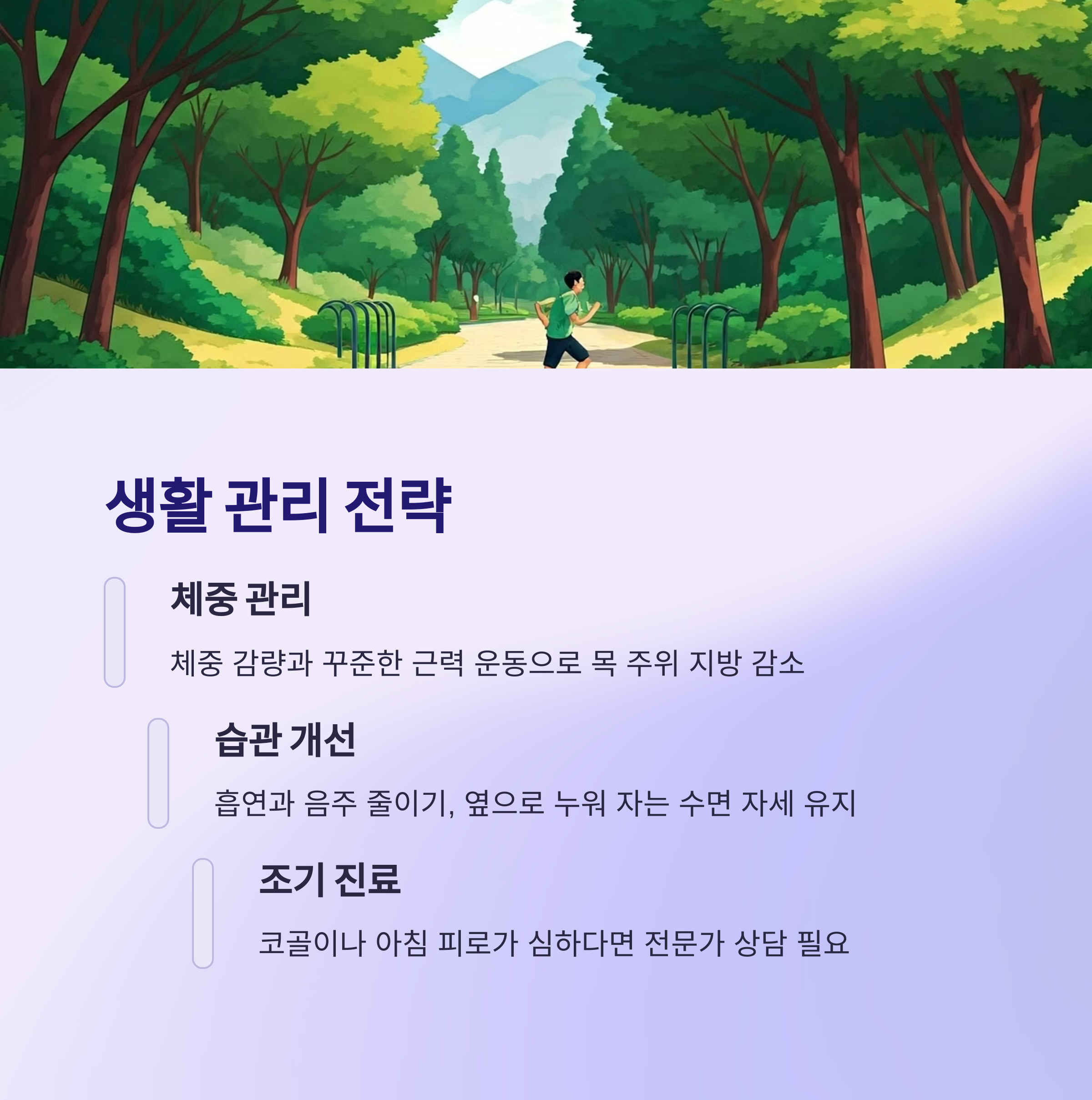 무엇보다 중요한 건 자신의 몸 신호를 무시하지 않는 거예요. 코골이나 아침 피로가 심하다면,