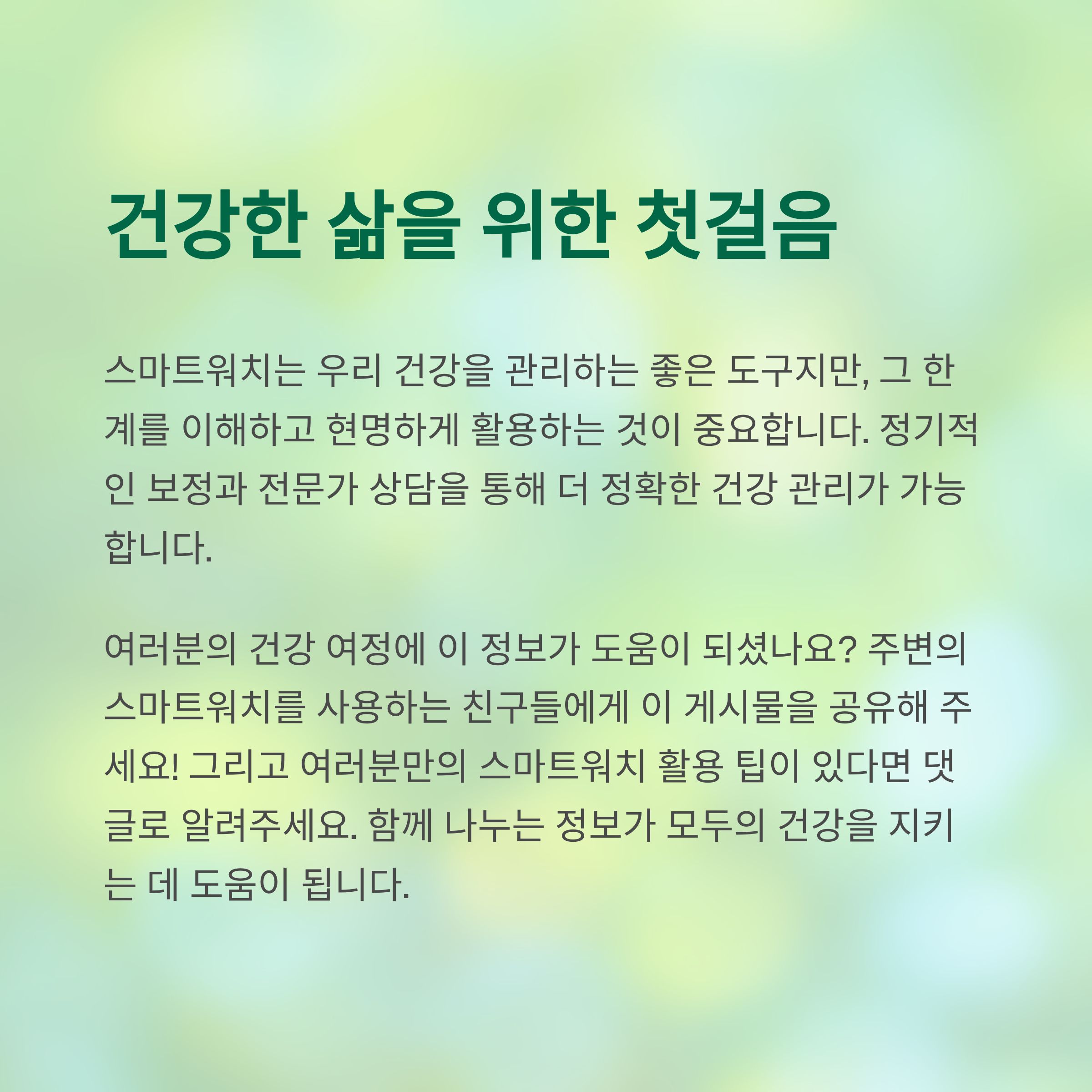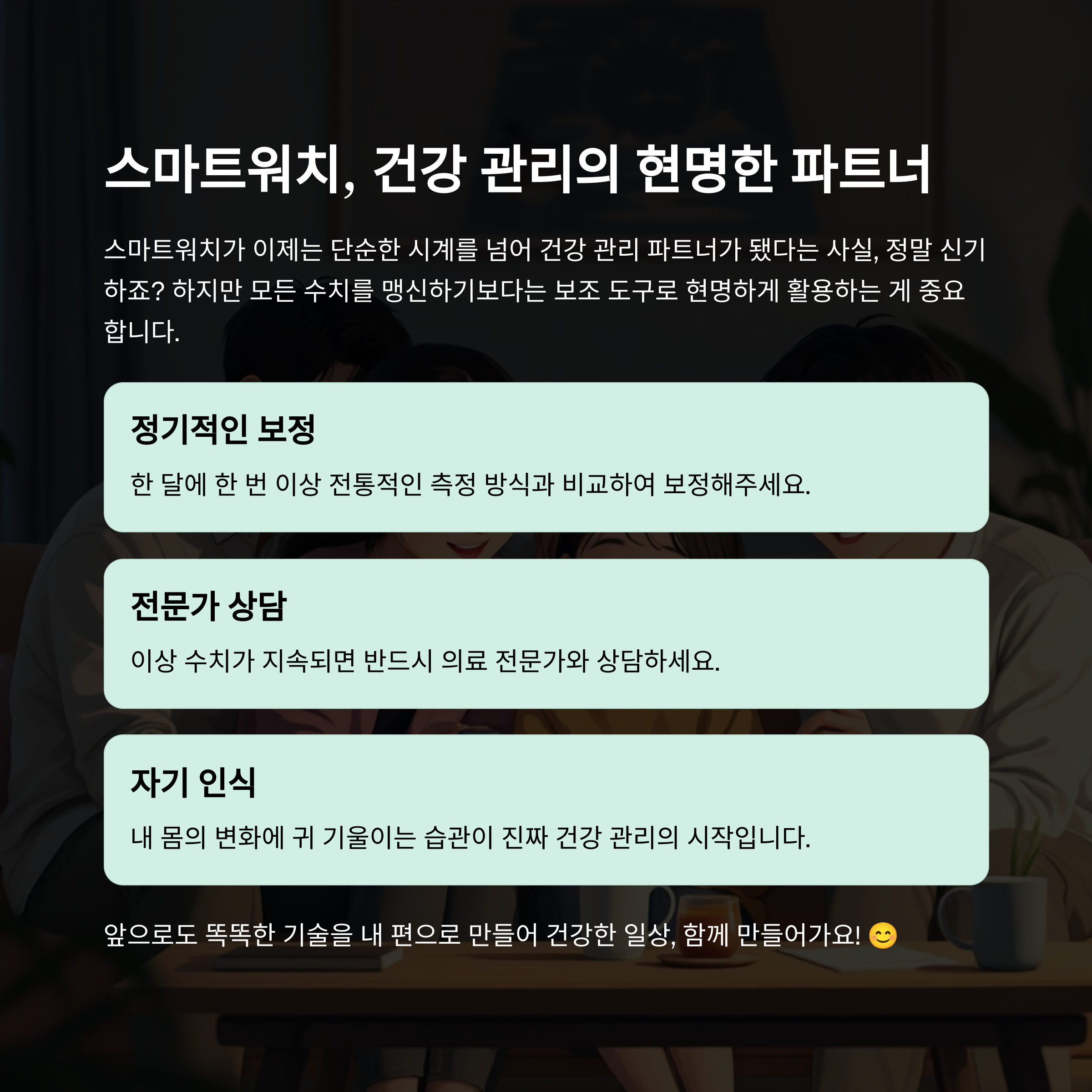 스마트워치가 이제는 단순한 시계를 넘어 건강 관리 파트너가 됐다는 사실, 정말 신기하죠? 하지만 모든 수치를 맹신하기보다는 보조 도구로 현명하게 활용하는 게 중요하다는 것도 꼭 기억해 주세요. 정기적인 보정, 전문가 상담, 그리고 내 몸의 변화에 귀 기울이는 습관이 진짜 건강 관리의 시작입니다. 앞으로도 똑똑한 기술을 내 편으로 만들어 건강한 일상, 함께 만들어가요! 😊