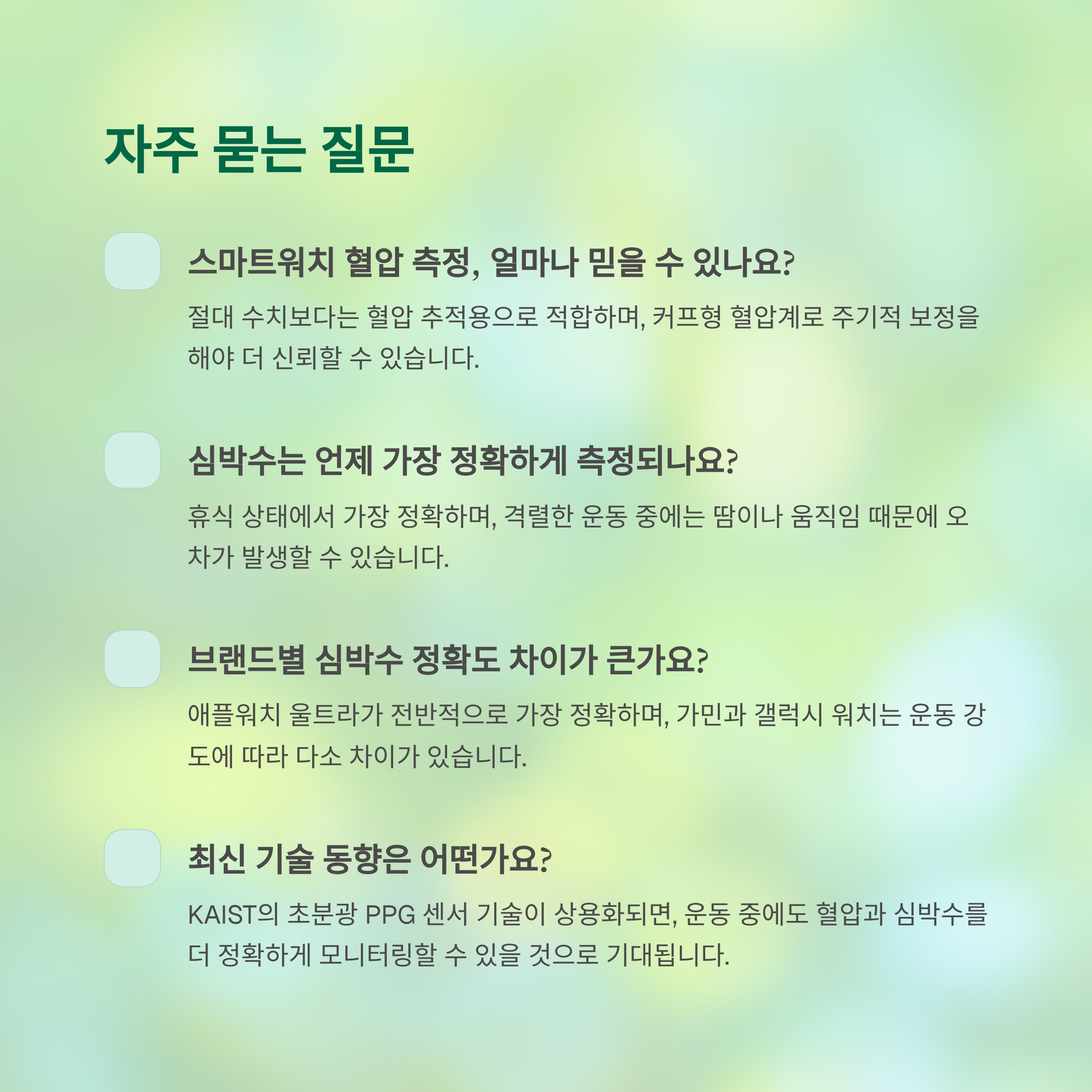 스마트워치는 절대 수치보다는 혈압 추적용으로 적합하며, 커프형 혈압계로 주기적 보정을 해야 더 신뢰할 수 있습니다.