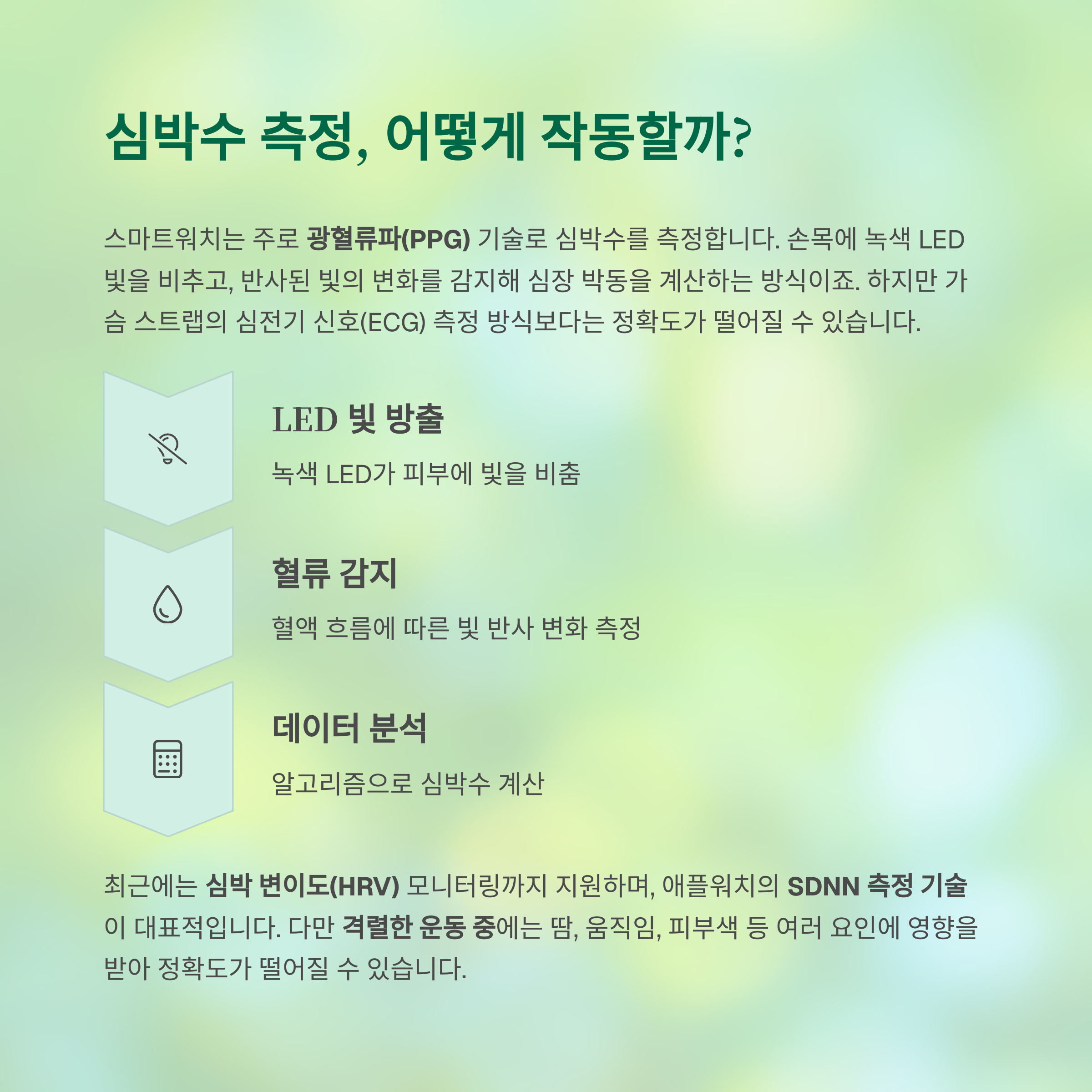스마트워치 심박수 측정은 주로 광혈류파(PPG) 기술을 사용해요. 손목에 녹색 LED 빛을 비추고, 반사된 빛의 변화를 감지해 심박수를 계산하죠. 하지만 가슴 스트랩처럼 심전기 신호(ECG)를 직접 측정하는 방식보다는 정확도가 떨어질 수 있어요. 특히 격렬한 운동 중엔 땀, 움직임, 피부색 등 여러 요인에 영향을 받습니다.