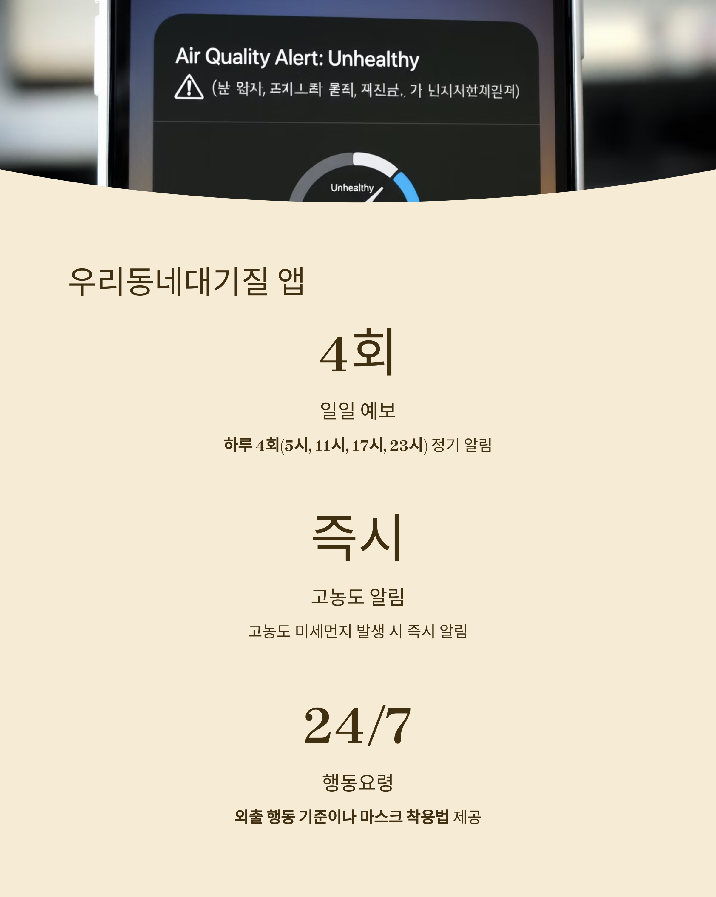 | 하루 4회 | 5시 / 11시 / 17시 / 23시 | 앱 팝업 / 문자 가능 |
