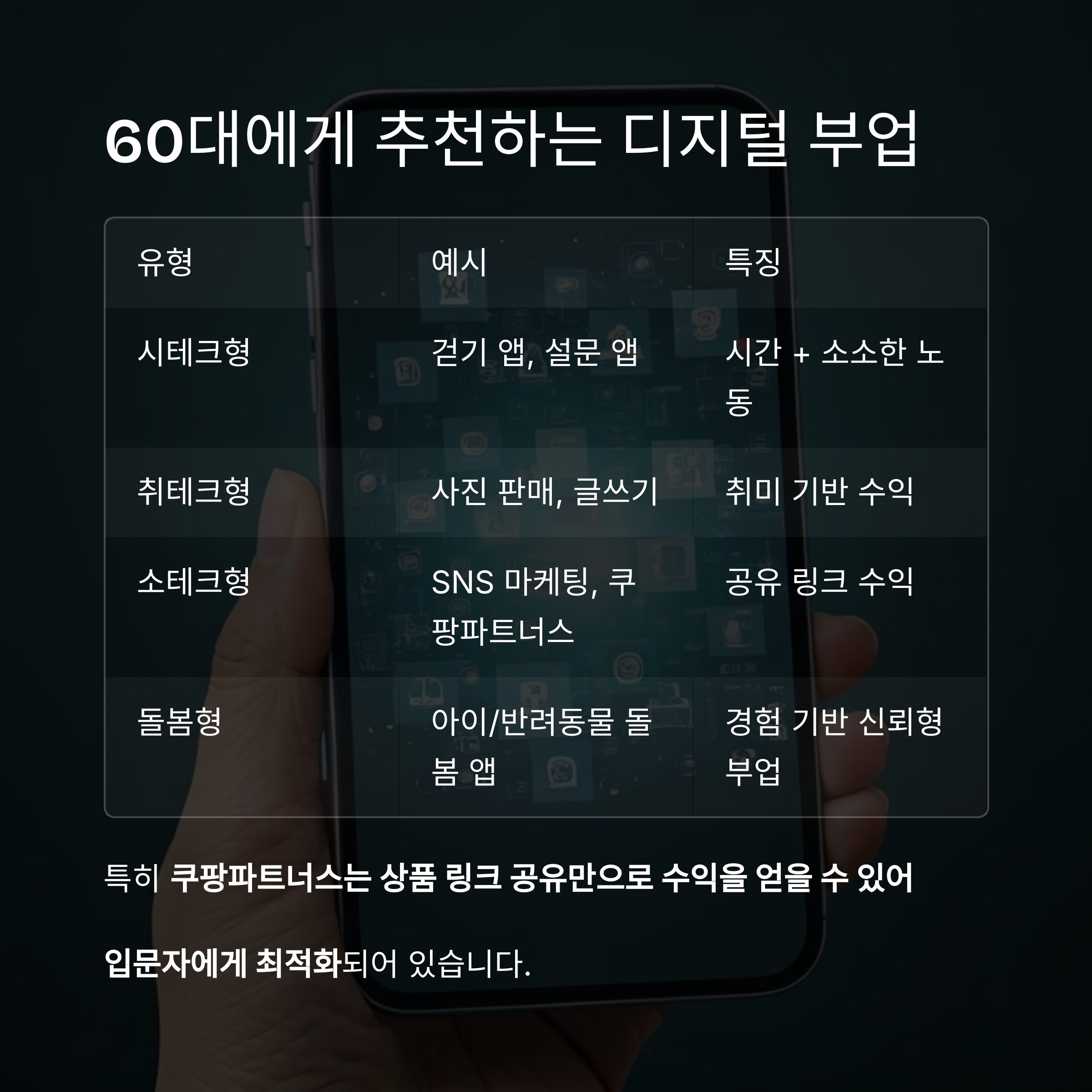 앱테크 외에도 60대가 도전하기 쉬운 디지털 부업 유형은 아래와 같습니다.
