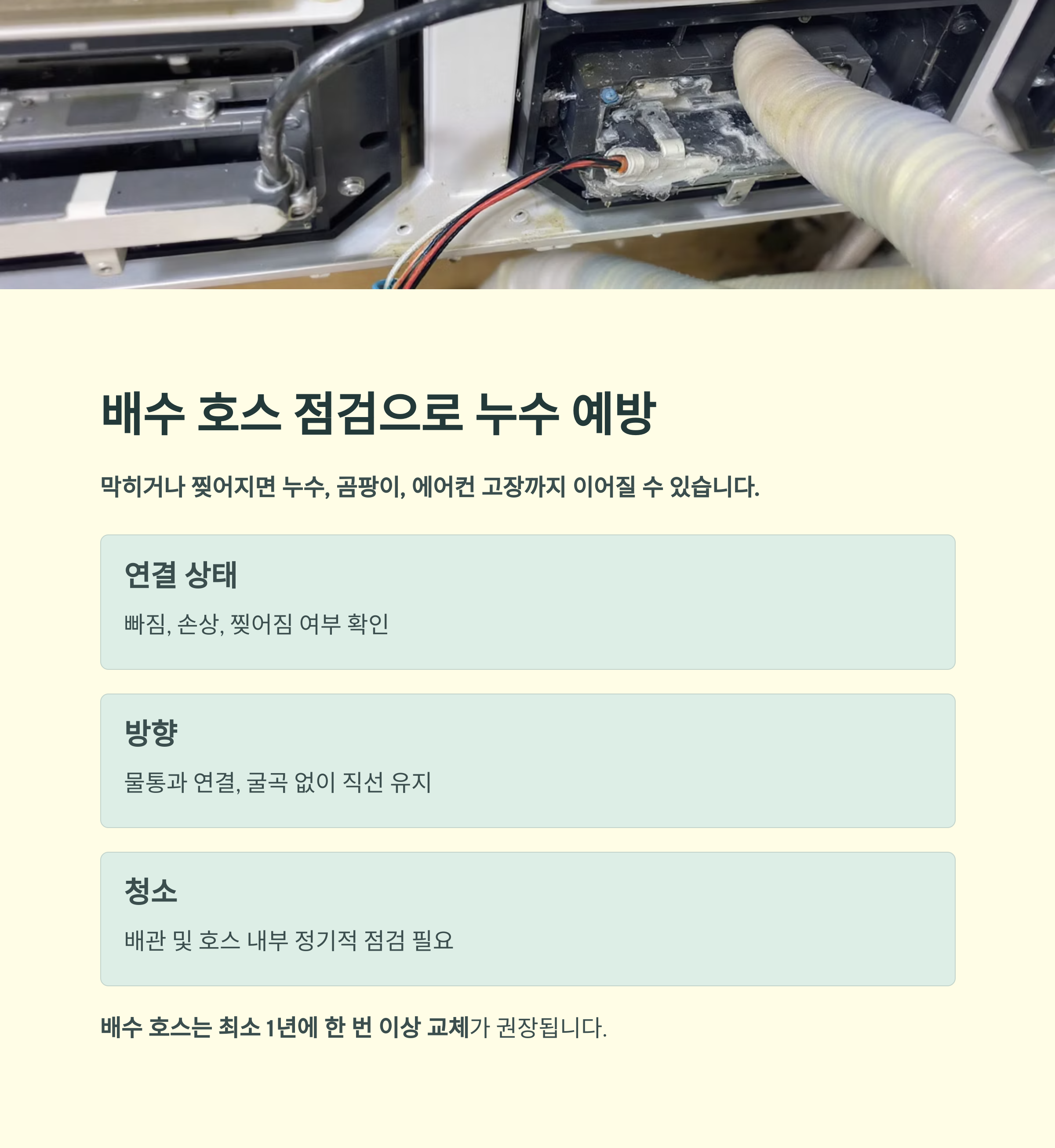 막히거나 찢어지면 누수, 곰팡이, 에어컨 고장까지 이어질 수 있습니다.