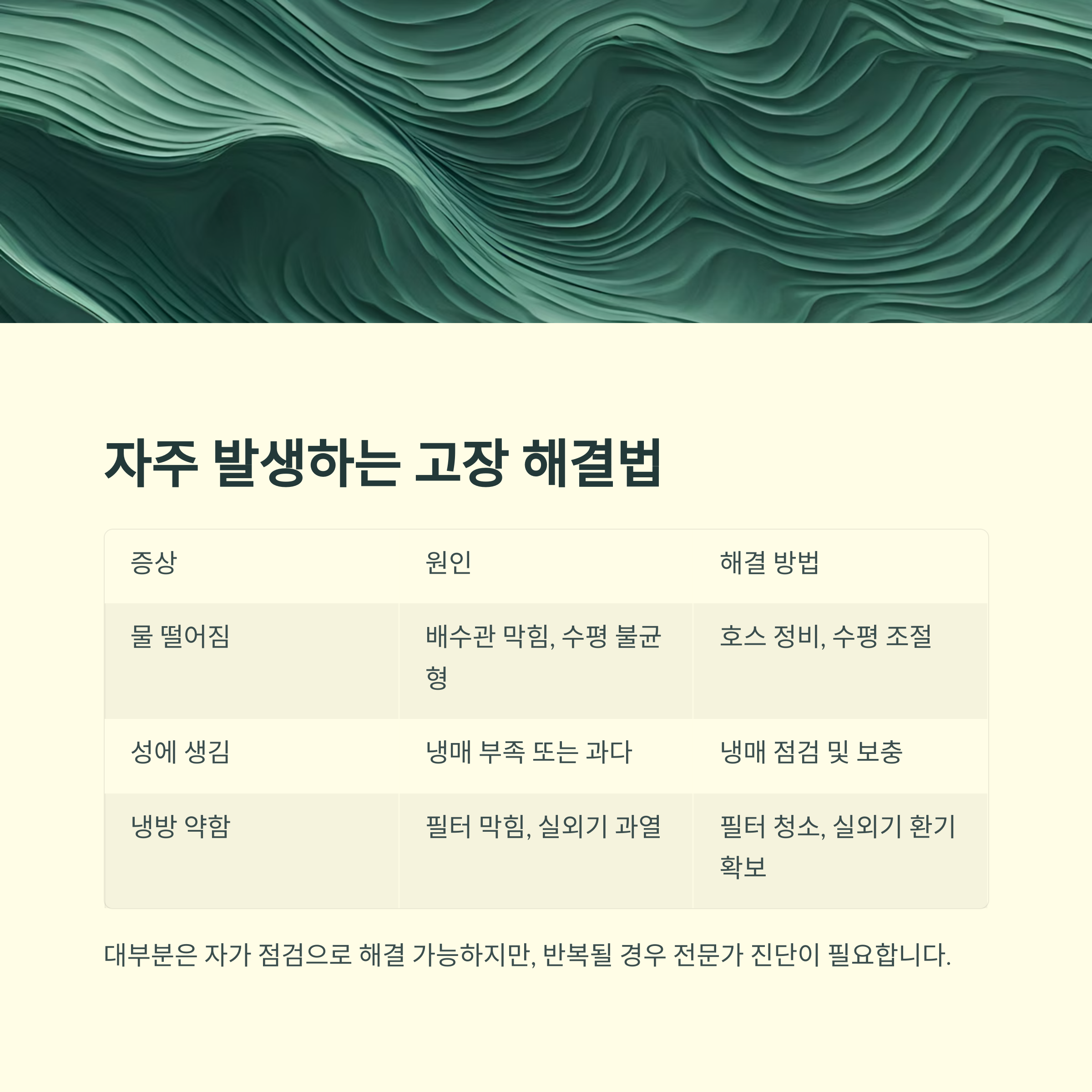 | 물 떨어짐 | 배수관 막힘, 수평 불균형 | 호스 정비, 수평 조절 |