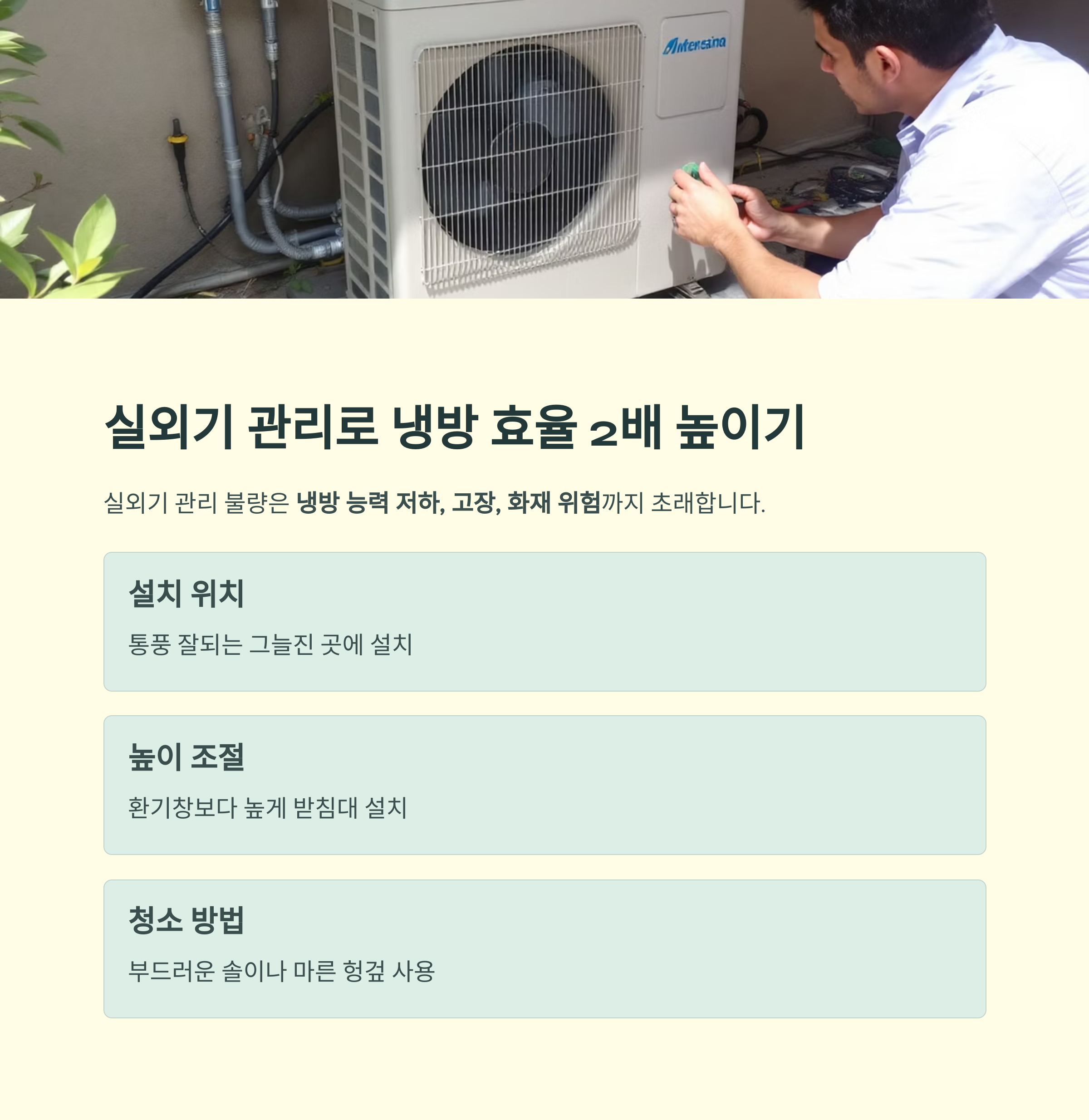실외기는 통풍이 잘되는 그늘진 곳에 설치하고, 주변 정리는 필수입니다.