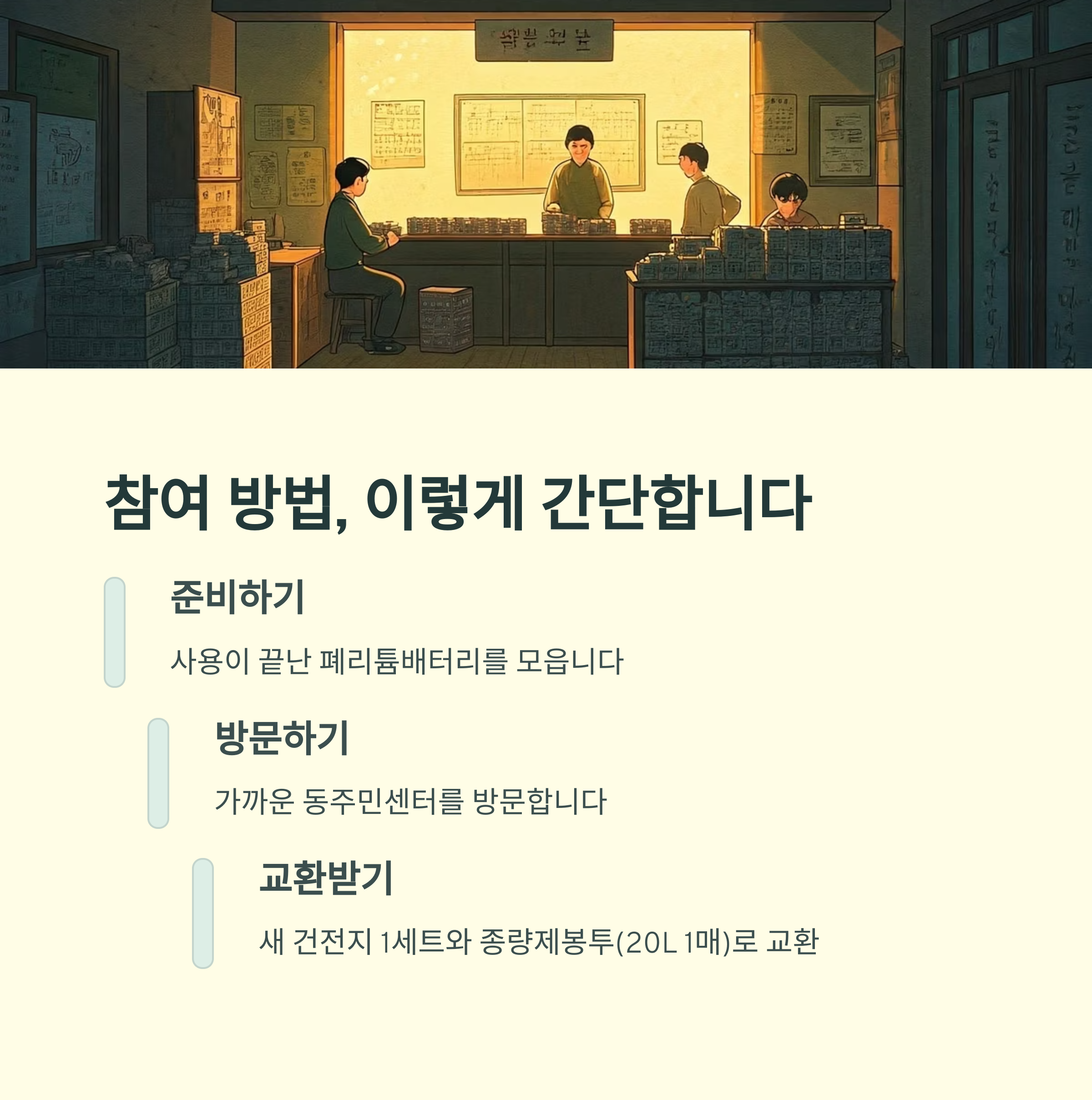 **새 건전지 1세트와 종량제봉투(20L 1매)**로 교환받을 수 있습니다.