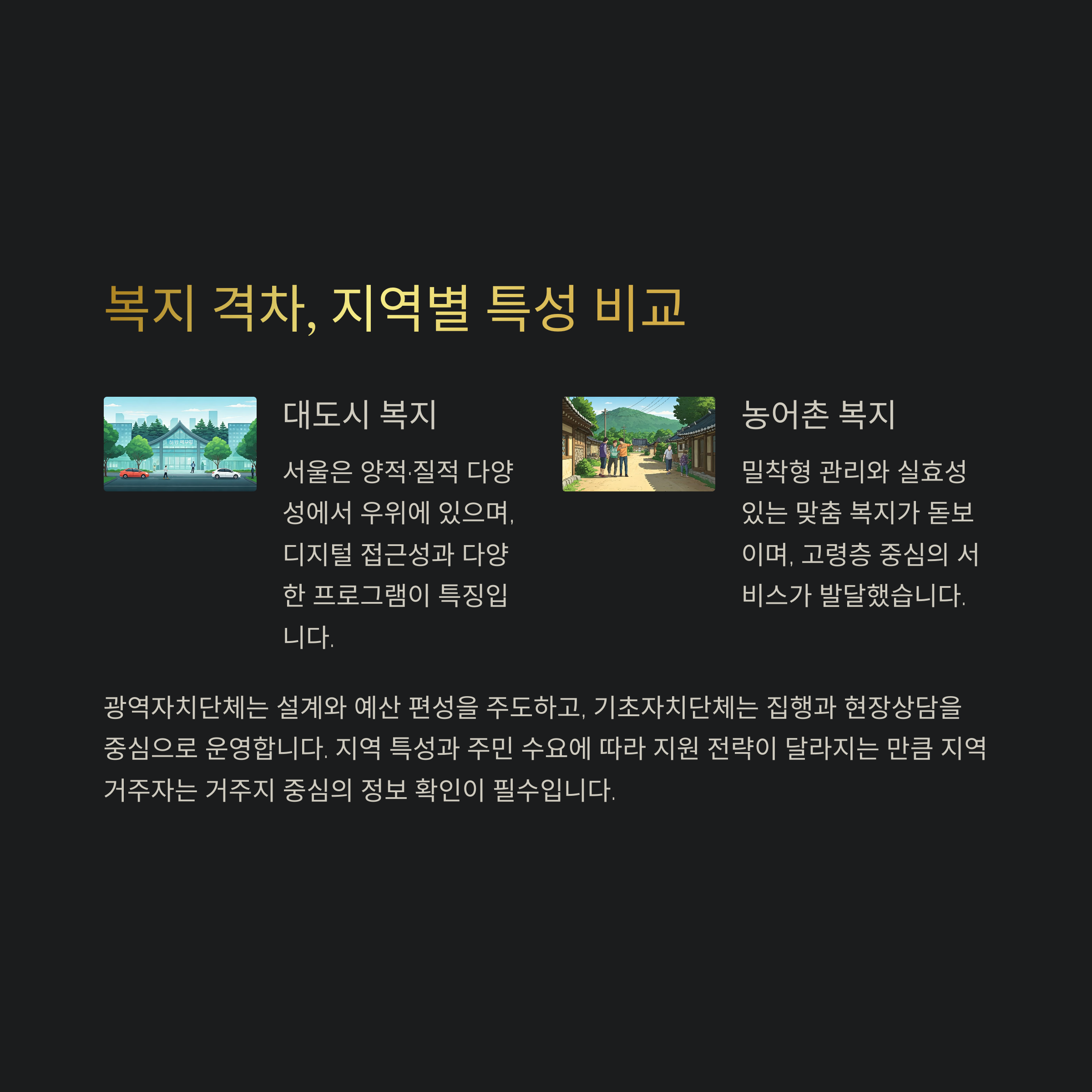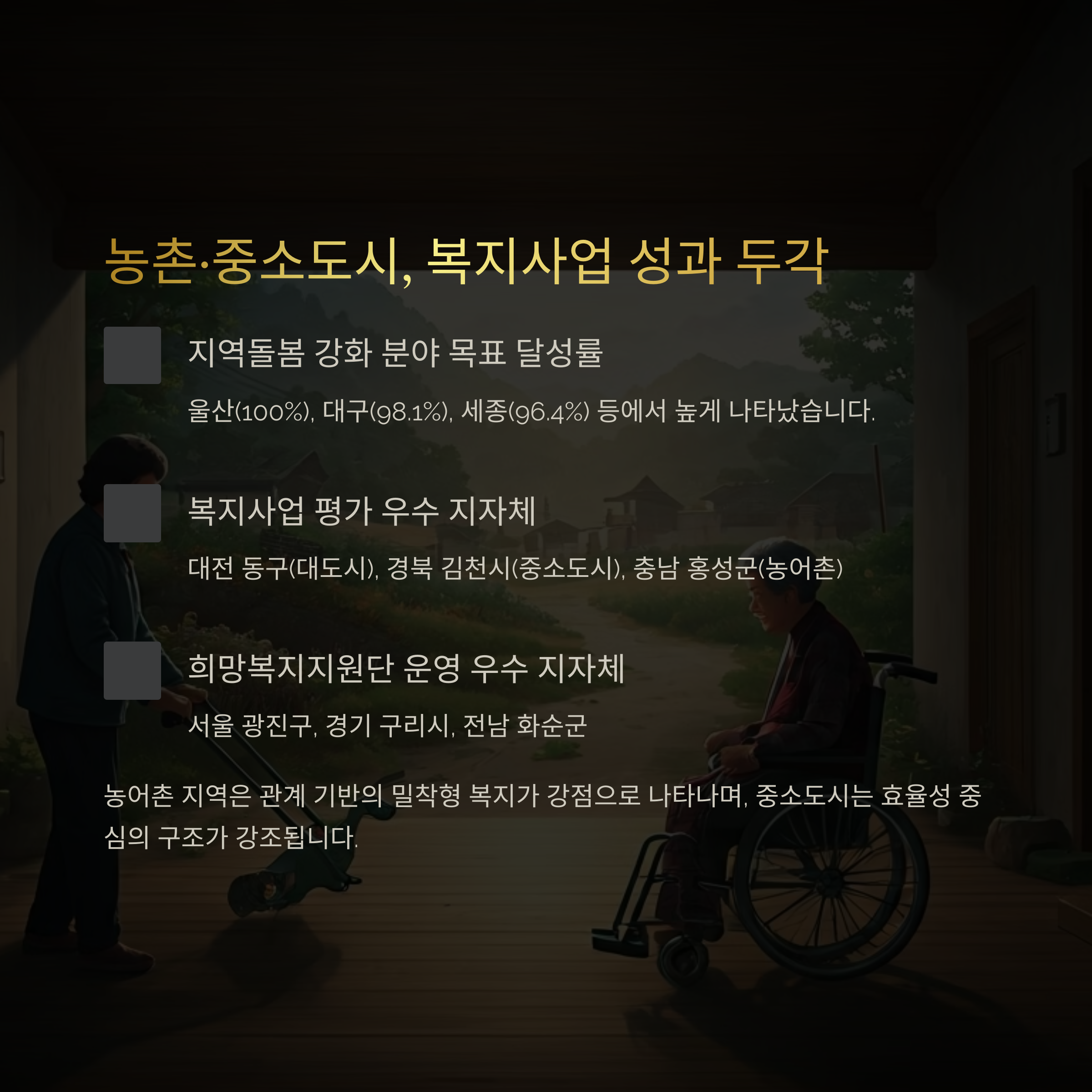 농어촌은 밀착형 관리와 실효성 있는 맞춤 복지가 돋보입니다.
