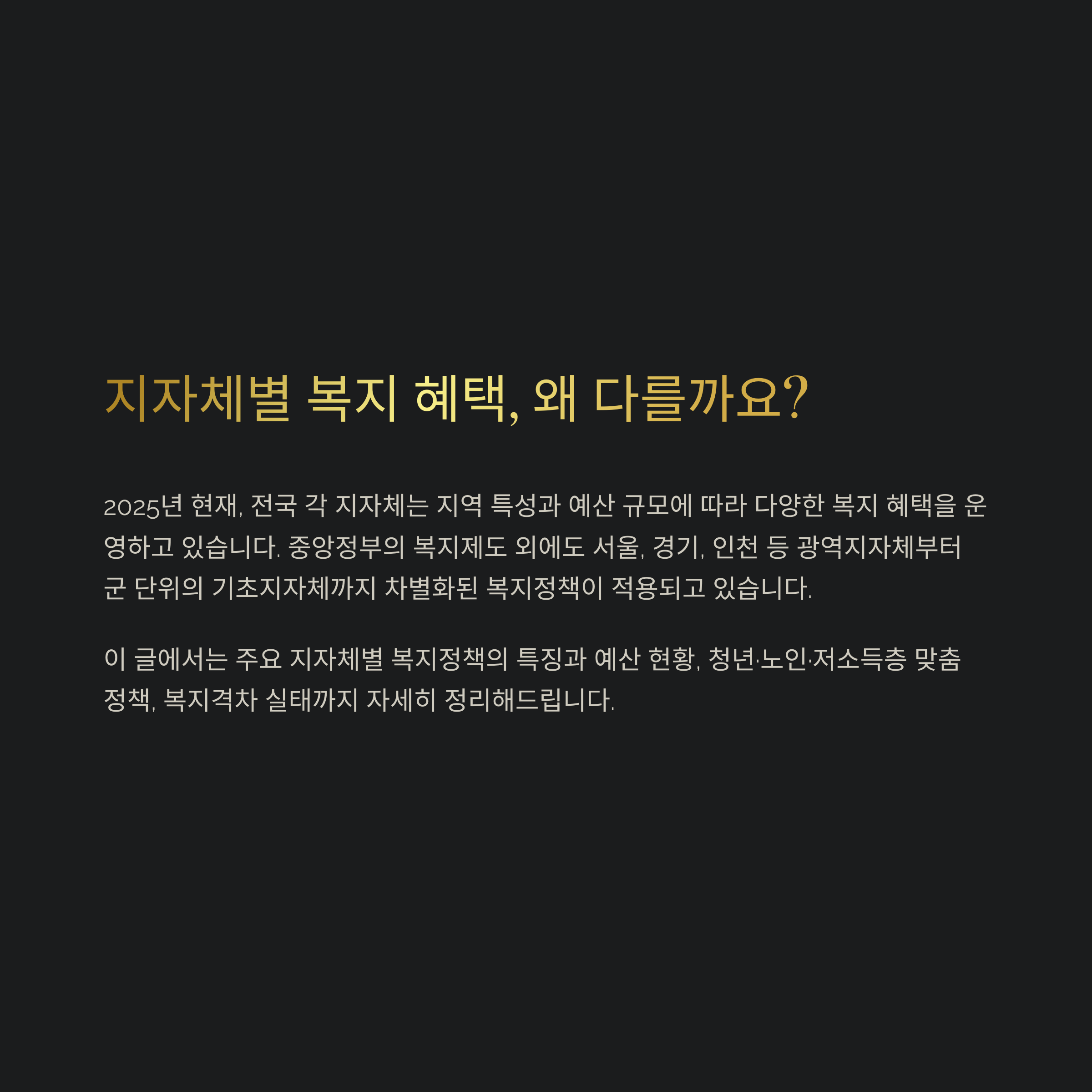 2025년 현재, 전국 각 지자체는 지역 특성과 예산 규모에 따라 다양한 복지 혜택을 마련해 운영하고 있습니다. 중앙정부의 복지제도 외에도 서울, 경기, 인천 등 광역지자체부터 군 단위의 기초지자체까지 차별화된 복지정책이 적용되고 있습니다. 이 글에서는 주요 지자체별 복지정책의 특징과 예산 현황, 청년·노인·저소득층 맞춤 정책, 복지격차 실태까지 자세히 정리해 드립니다. 지금 살고 있는 우리 지역의 숨은 혜택을 꼭 확인해 보세요.