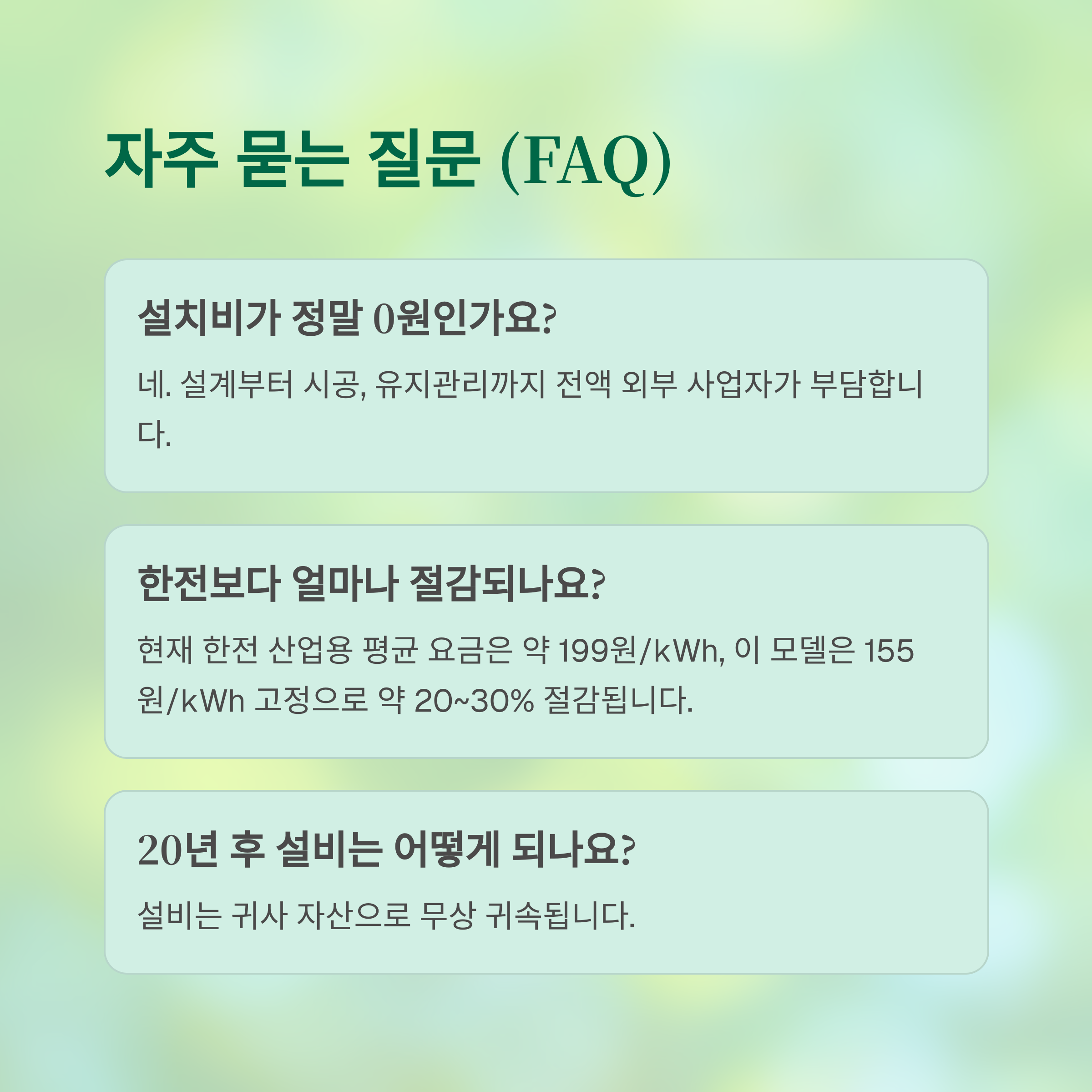 "설비 투자 없이, 전기요금 절감 + 설비 자산 확보 + ESG 실적까지 동시에 가능한 드문 기회입니다."