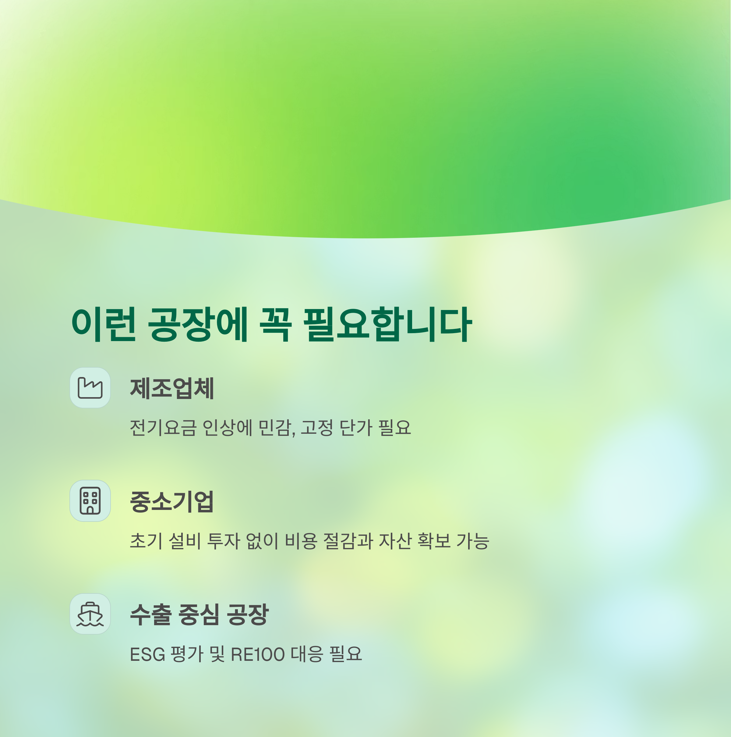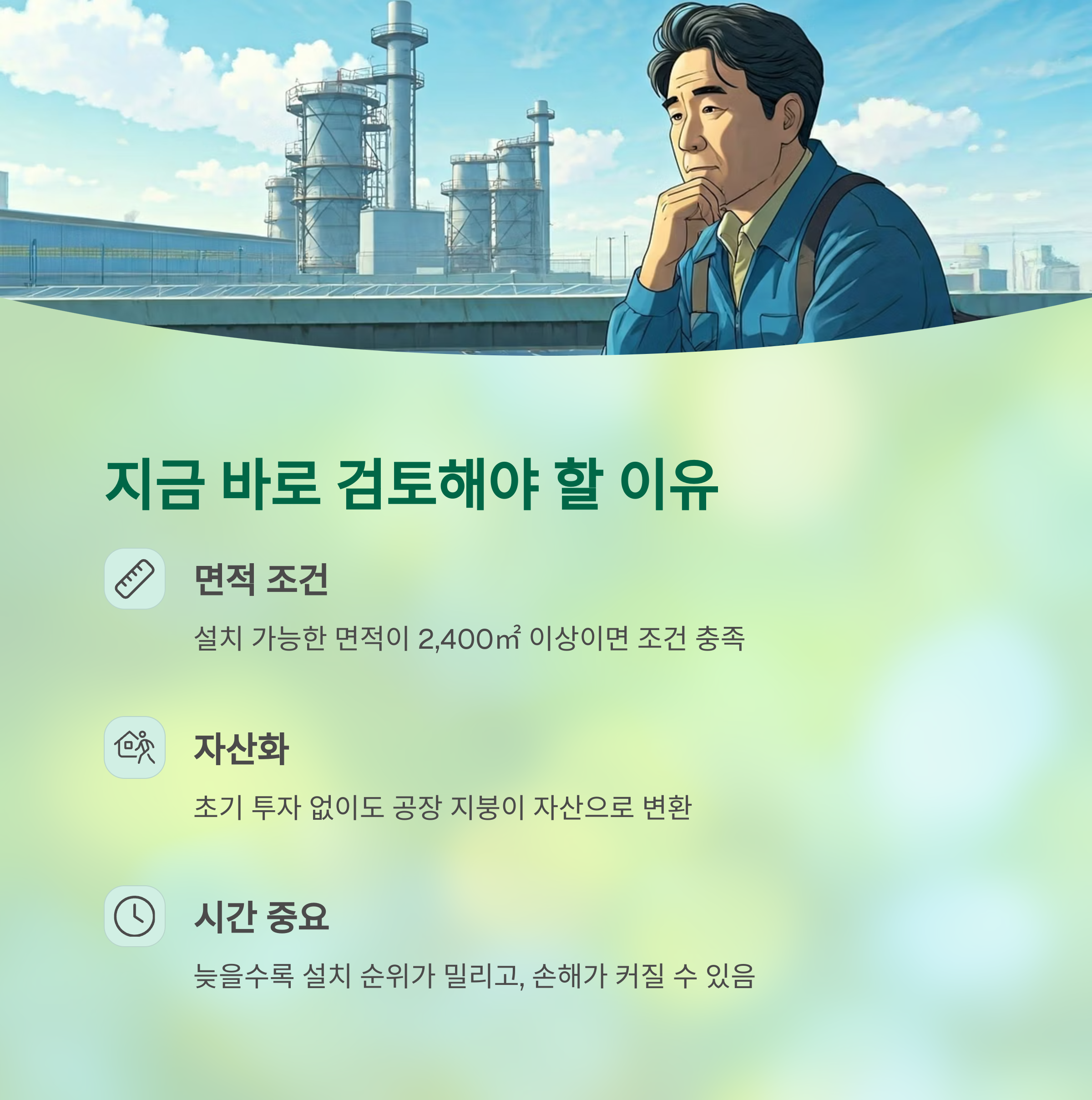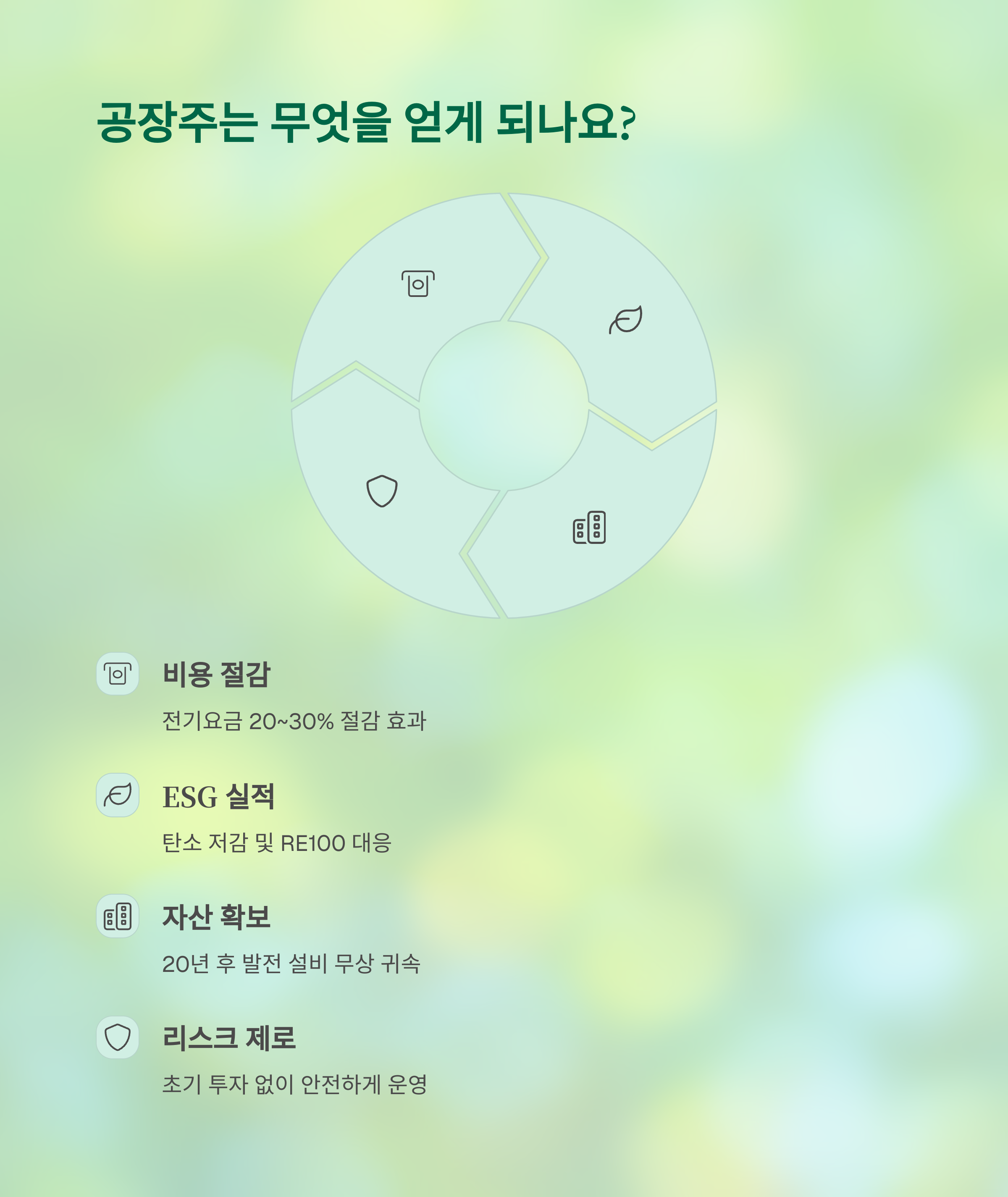 ✔ 초기 투자 없이도 공장 지붕이 자산으로 바뀔 수 있습니다.