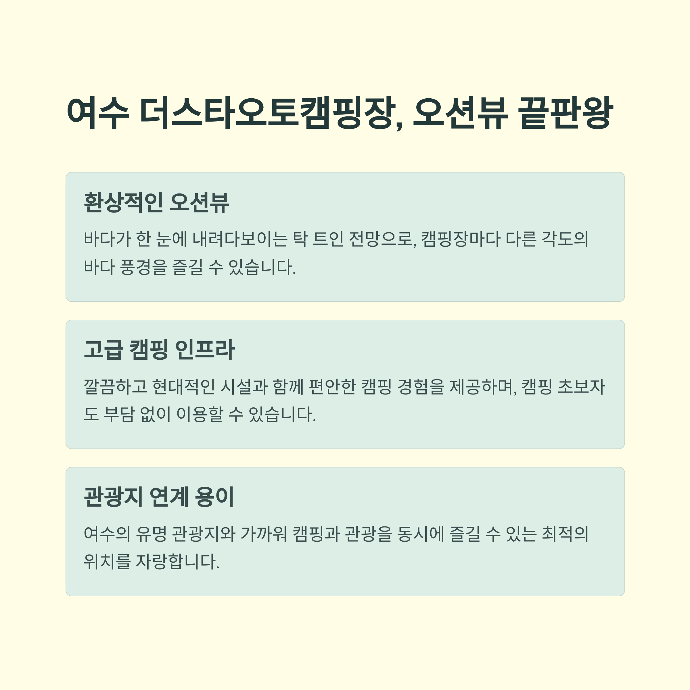 | 더스타오토 | 해변 | 오션뷰, 관광 인접 | 여행+캠핑 병행 캠퍼 |