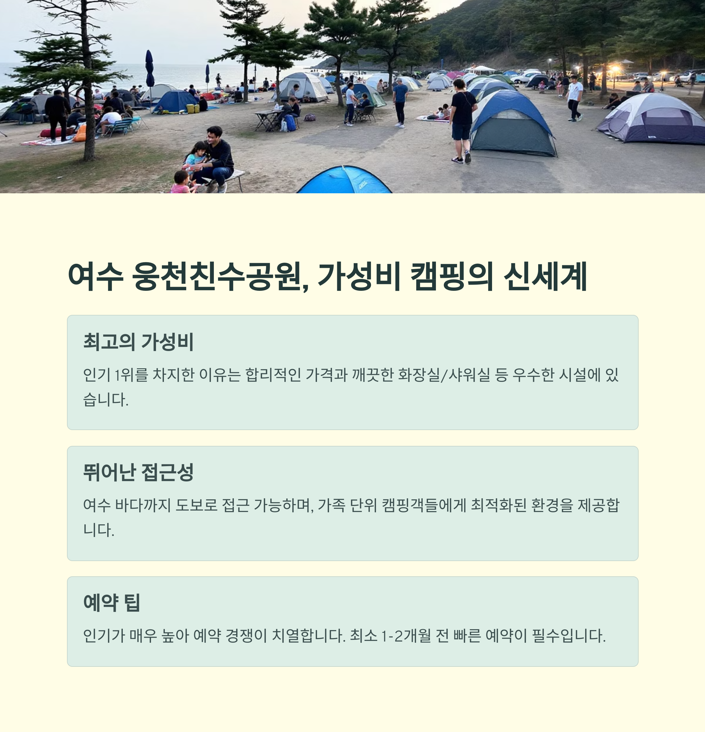 | 웅천친수공원 | 해변 | 가성비, 접근성 | 가족, 초보 캠퍼 |