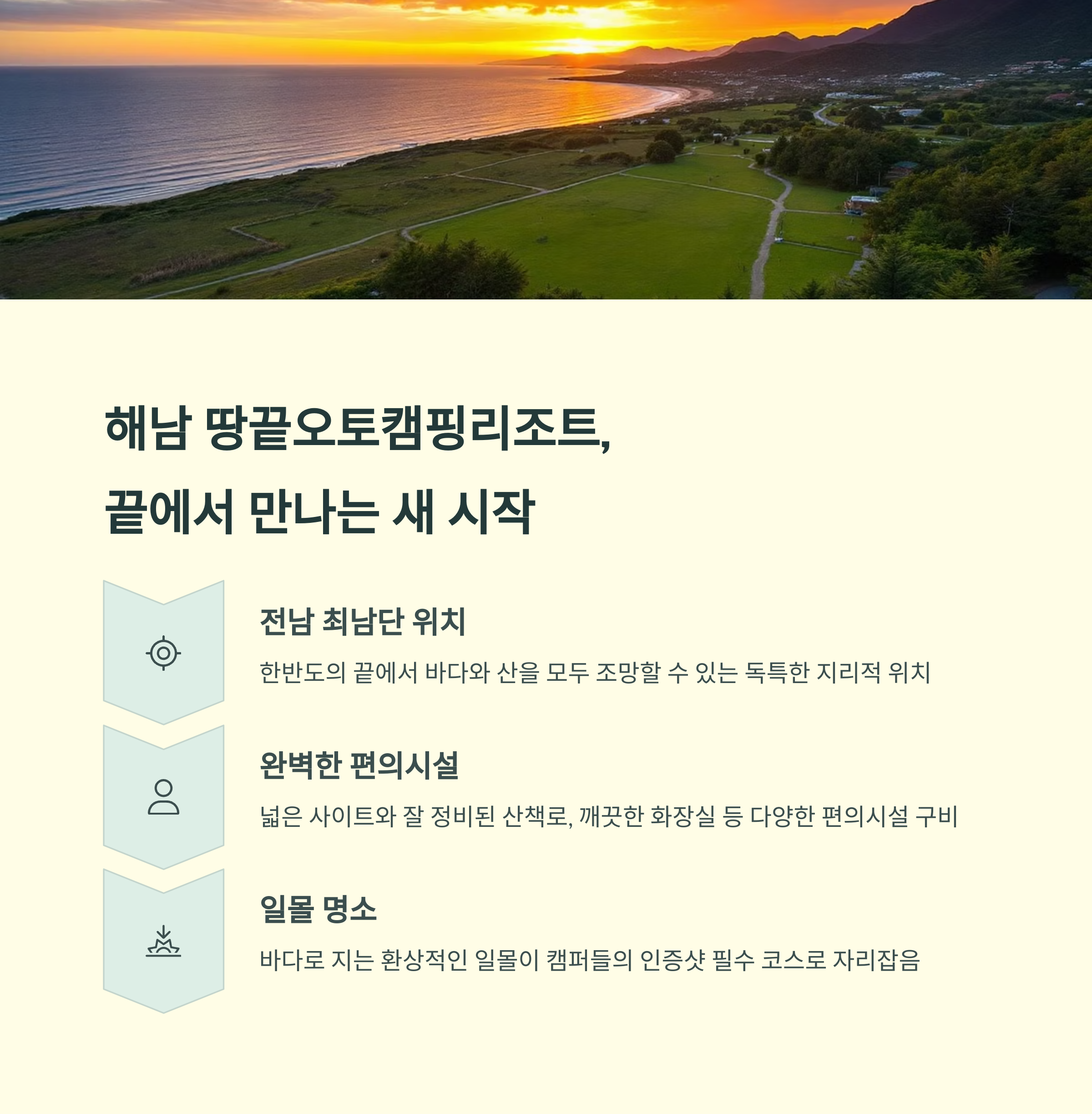 | 땅끝리조트 | 해변+소나무 | 조용한 위치, 편의시설 | 커플, 휴식형 캠퍼 |