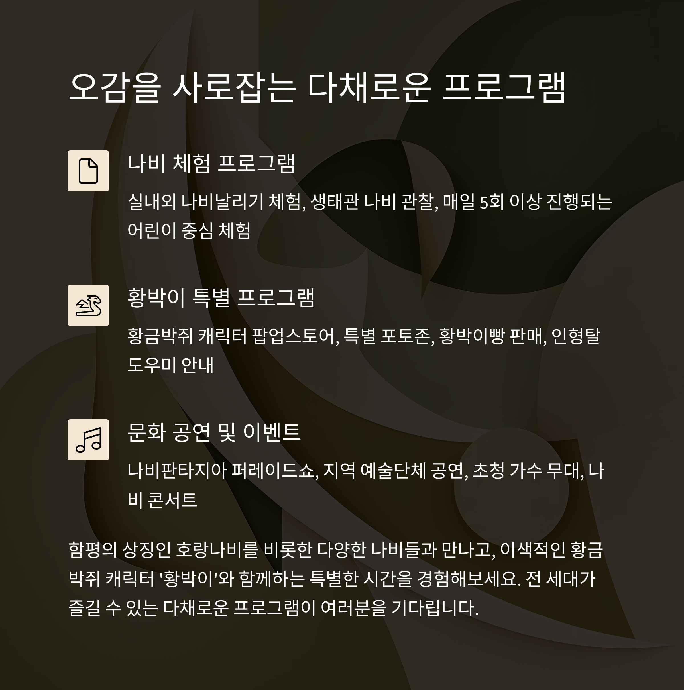 이번 축제에서는 살아있는 나비 관람뿐만 아니라 황금박쥐 캐릭터 '황박이'를 활용한 팝업스토어와 포토존, 그리고 굿즈 판매 등 다양한 즐길거리도 함께 마련됩니다. 중앙광장에서 펼쳐지는 나비판타지아 퍼레이드쇼와 전통놀이, 동물농장 체험, 만들기 프로그램은 아이들과 함께하는 가족 단위 방문객들에게 큰 인기를 끌고 있습니다. 다양한 지역 예술단체의 공연과 초청 가수 무대, 나비 콘서트 등 볼거리 또한 풍성하여 머무는 시간 내내 지루할 틈이 없습니다.