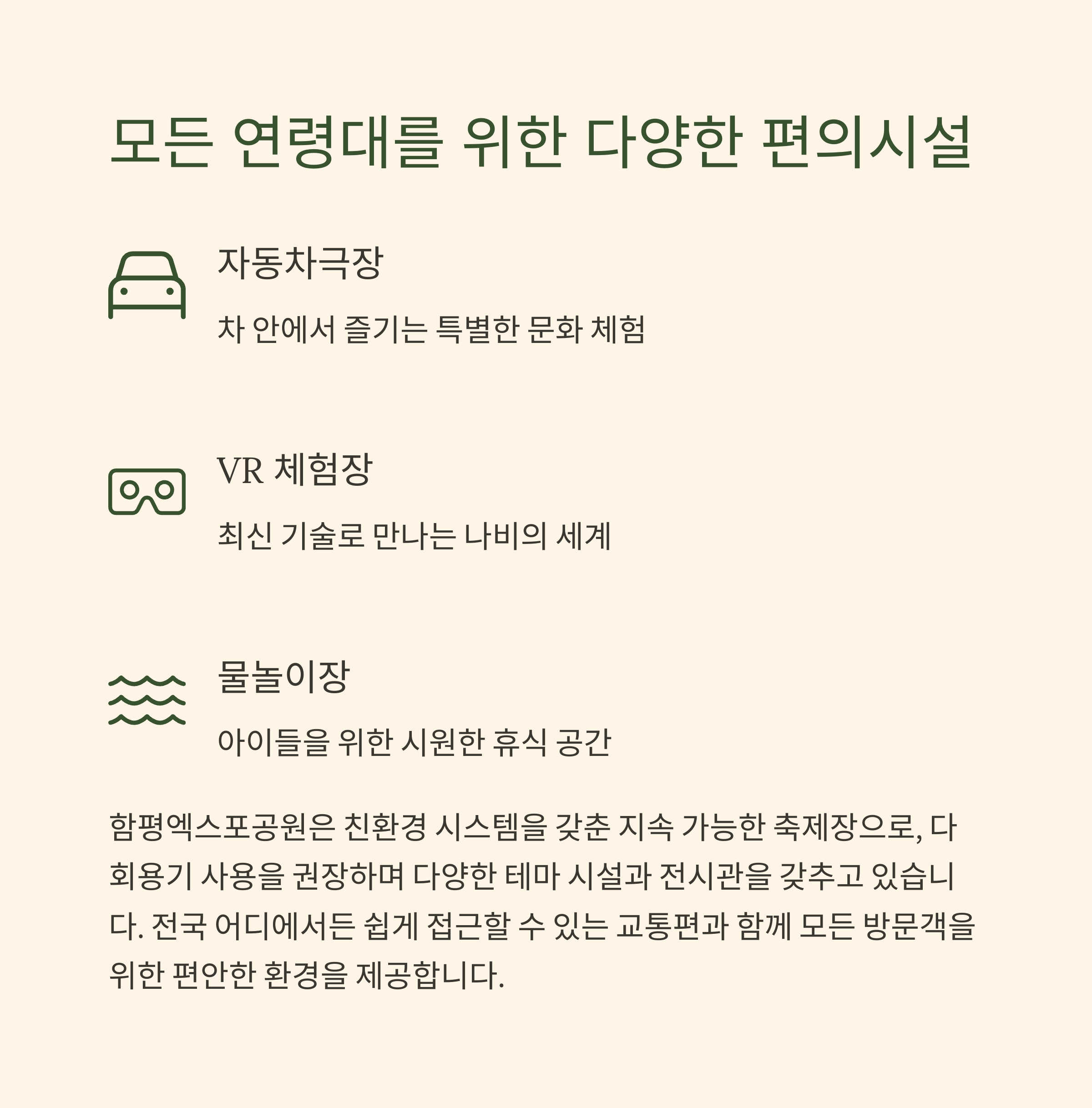 함평엑스포공원은 다양한 테마 시설과 전시관을 갖추고 있으며, 자동차극장과 VR 체험장, 생태교육관 등 즐길거리가 가득합니다. 교통편도 잘 정비되어 있어 전국 어디에서든 접근이 용이하며, 축제장 내 다회용기 사용과 친환경 시스템 구축을 통해 지속 가능한 축제를 추구하고 있습니다.