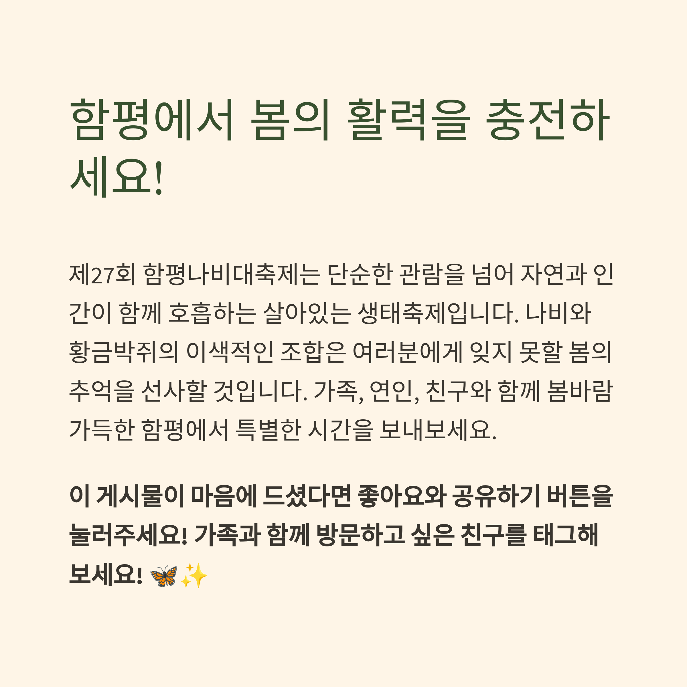 이번 함평나비대축제에 대해 궁금한 점이나 기대하는 프로그램이 있다면 댓글로 공유해주세요! 다른 분들의 소중한 의견도 함께 읽고 소통할 수 있습니다. 축제의 즐거움은 함께 나눌 때 더 커집니다.
