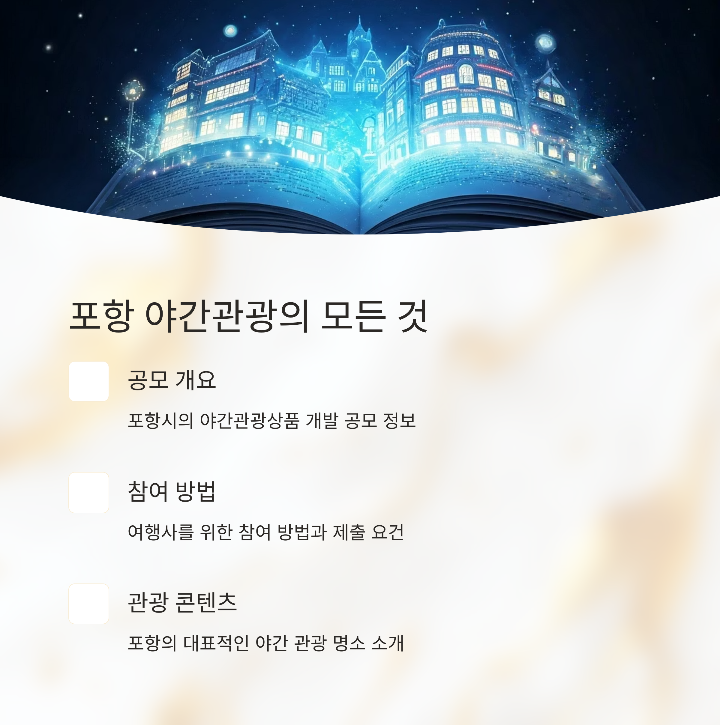 실제 공모 참여를 준비하는 여행사라면, 단순한 코스 제안보다는 포항이라는 도시의 정체성과 밤이라는 테마의 감성을 잘 녹여낸 기획이 중요합니다. 아래의 준비 팁을 참고해 보세요!
