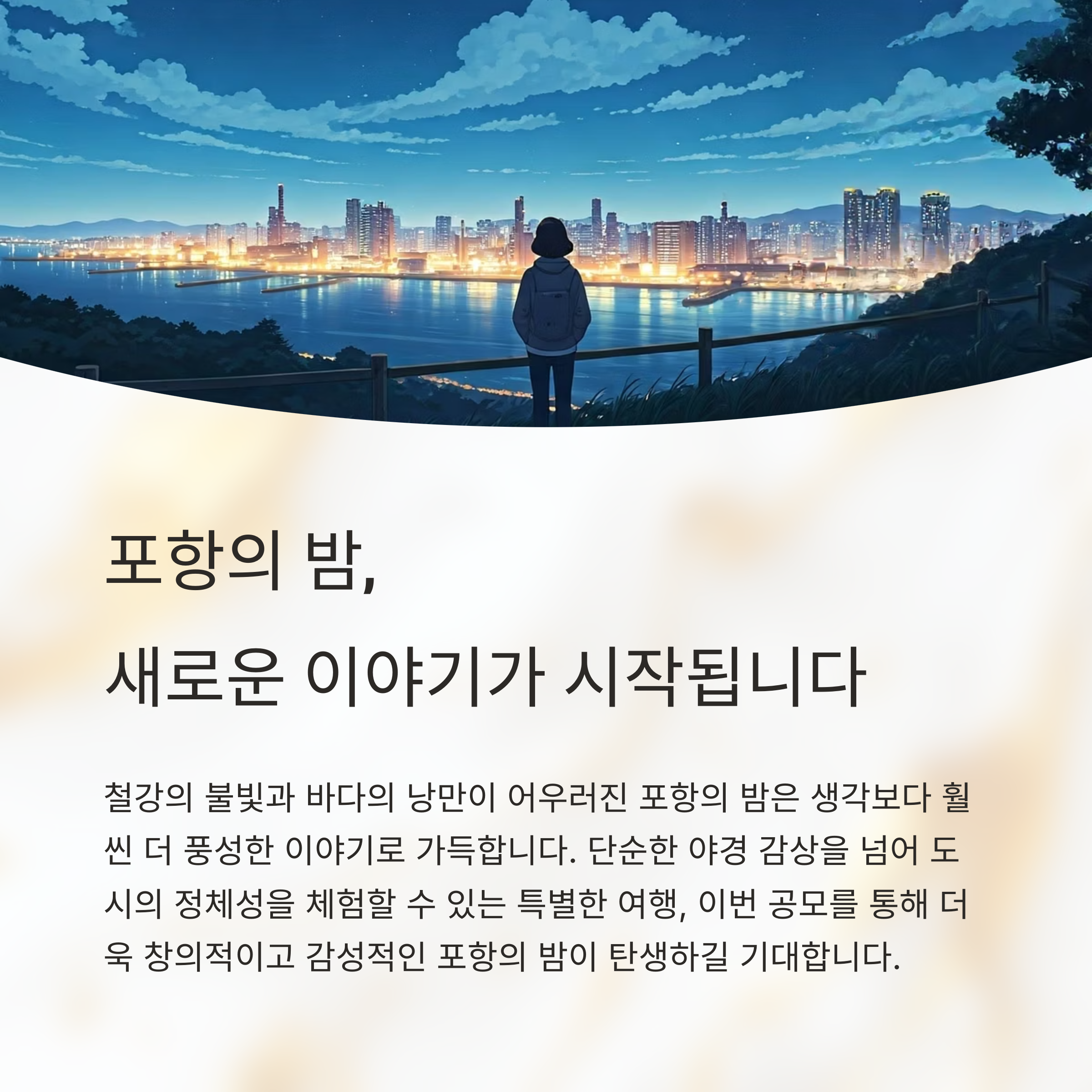 포항의 밤은, 생각보다 훨씬 더 풍성하고 다채로운 이야기로 가득 차 있습니다. 철강의 불빛이 도시를 감싸고, 바다의 잔잔한 파도가 낭만을 더하죠. 단순히 야경을 감상하는 데 그치지 않고, 그 안에 숨겨진 도시의 정체성을 체험하고 싶은 분들이라면 이번 포항시의 체류형 야간관광 공모는 주목할 만한 기회입니다. 여행사를 비롯한 모든 기획자들이 이 공모를 계기로 더 창의적이고 감성적인 시선을 가지고 포항을 다시 바라보길 바랍니다. 여러분의 멋진 아이디어로 포항의 밤을 더욱 특별하게 만들어 주세요!